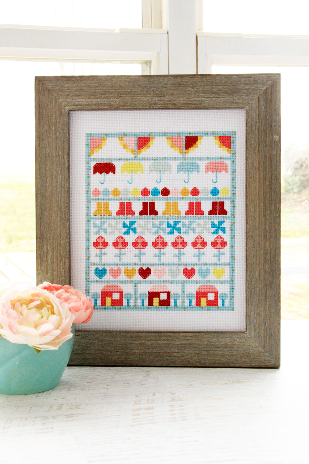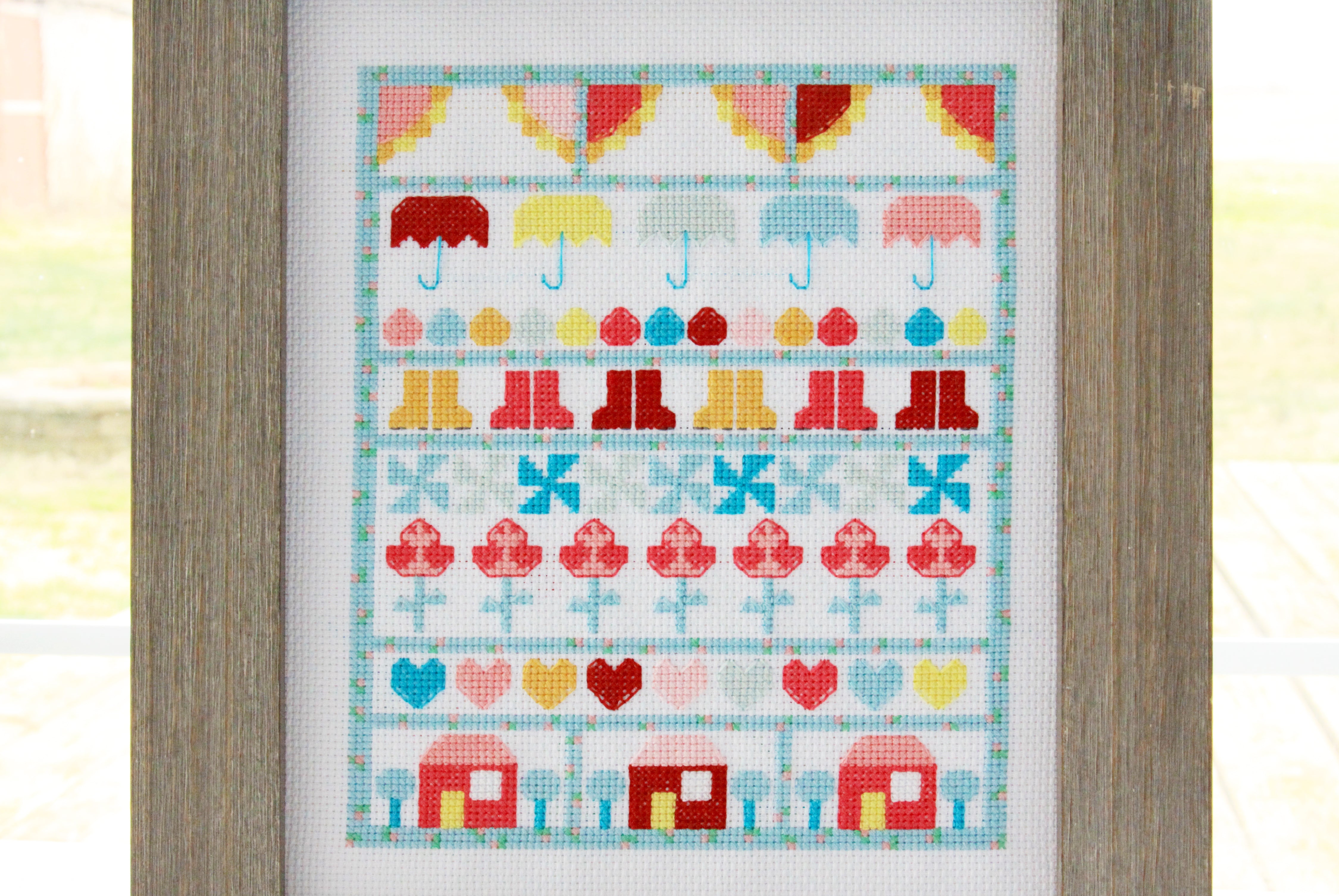 Stitch up this sweet Singing in the Rain Cross Stitch pattern with sweet designs on every row and a fun little floral border! It makes a great project for Spring or any time of year!