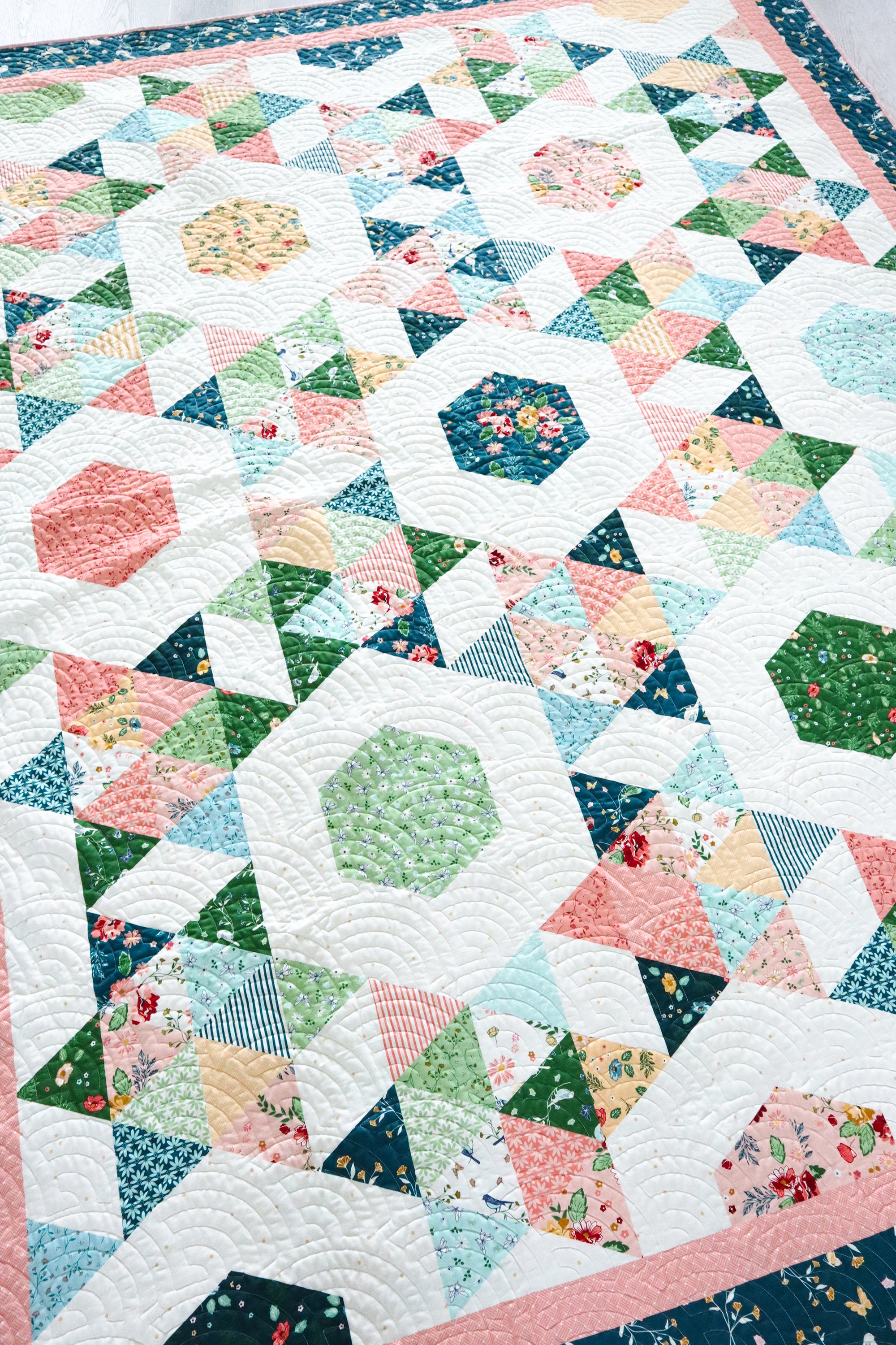 Create a gorgeous vintage inspired quilt in no time with this easy quilt pattern! This quilt looks so pretty in my Melody fabrics for Riley Blake Designs. Starlight is fat quarter friendly and finishes at 76" x 97".
