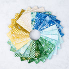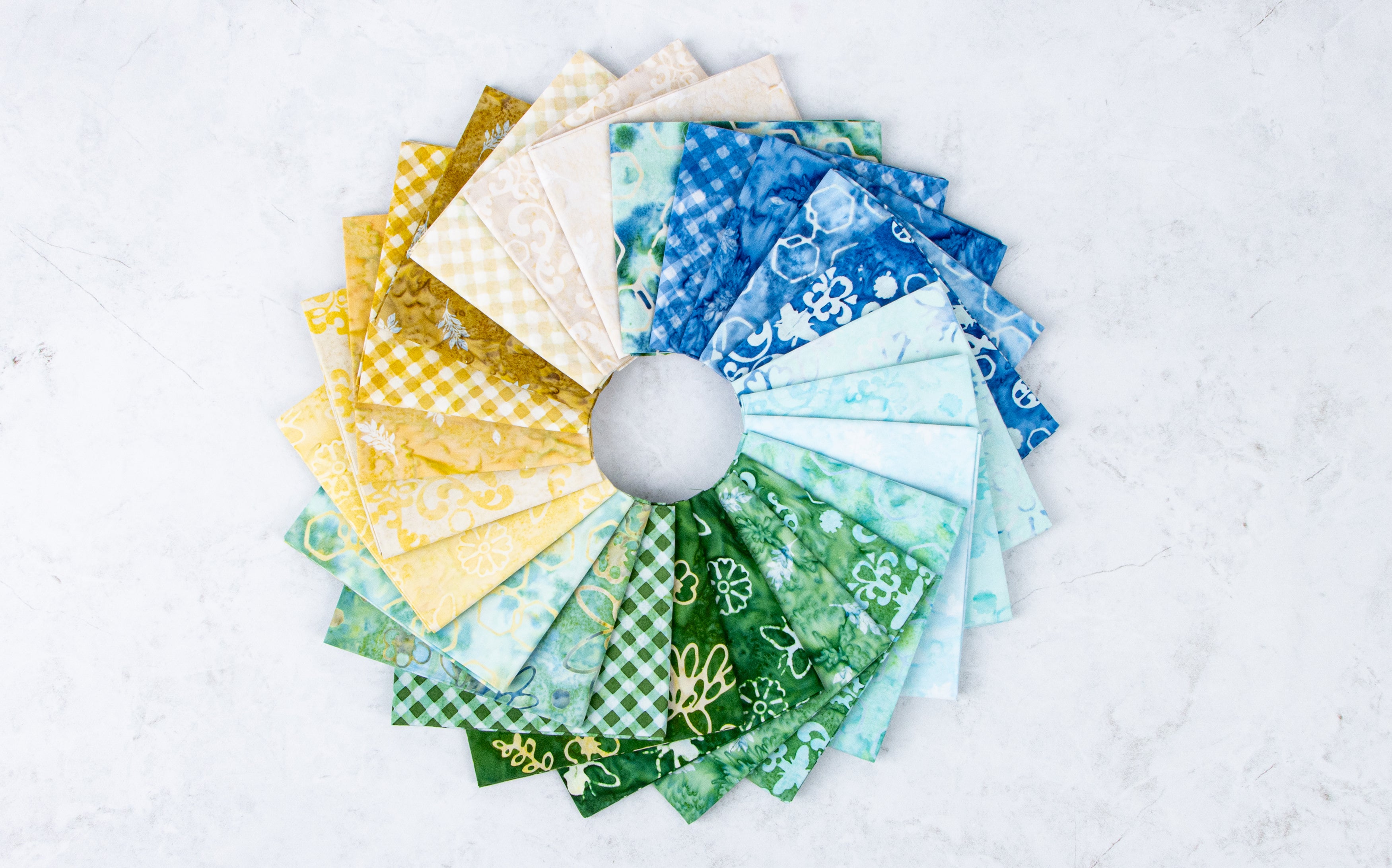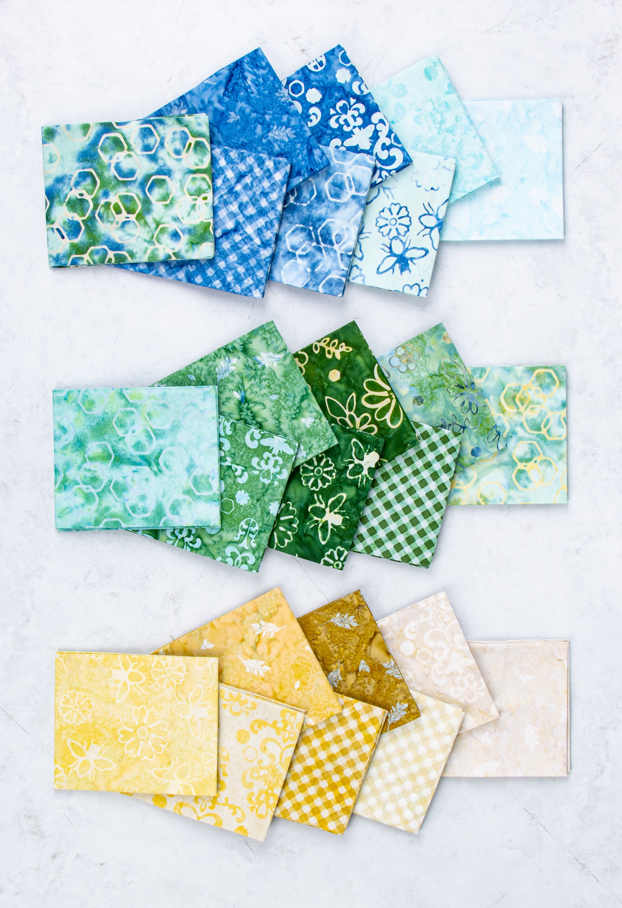 Watercolor Daisies is a fresh and playful batik collection inspired by some of our favorite things—daisies, bees, honeycombs, and sunshine. The prints are full of personality, with soft watercolor textures in shades of blue, golden yellow, and green. It’s a lighthearted mix that’s perfect for quilts, bags, and all your sunny-day sewing projects.