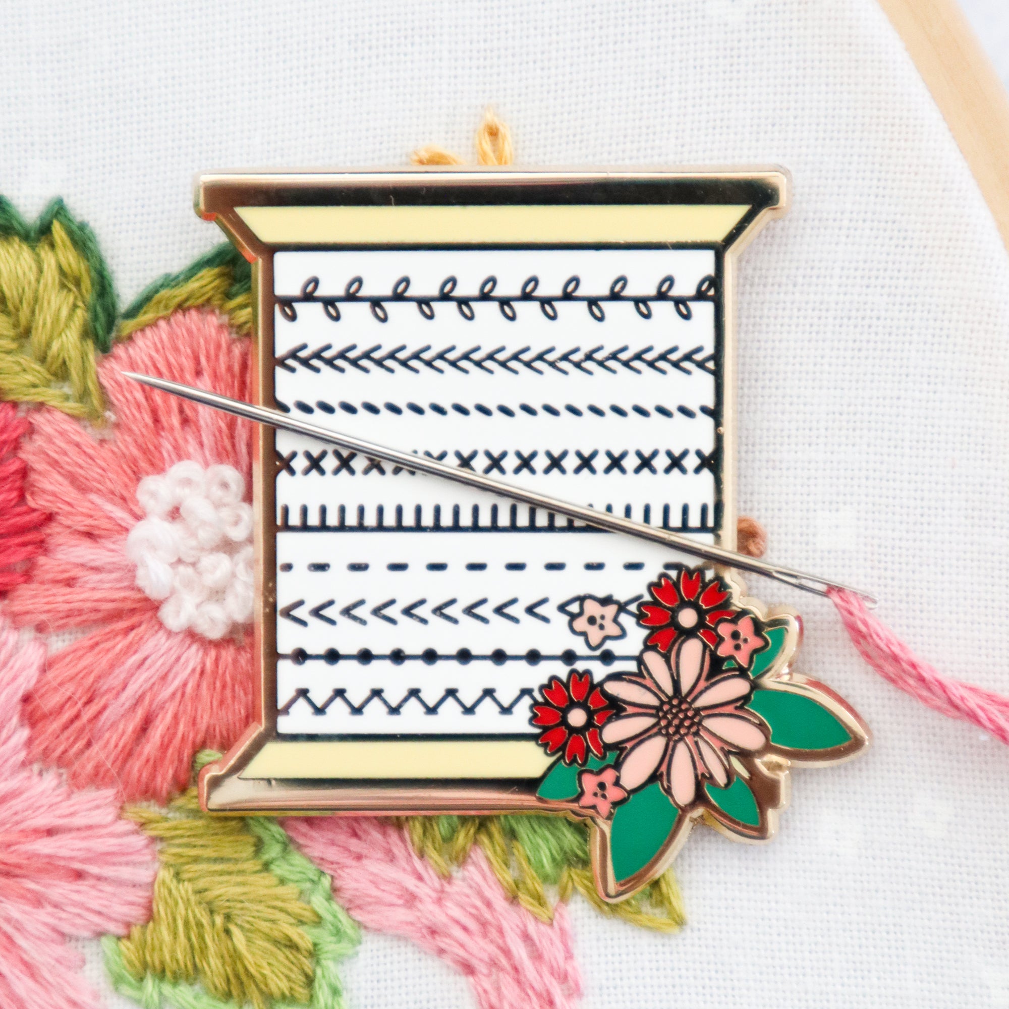 With its creamy spool, delicate stitch details, cheerful blooms, and warm gold outline, this needle minder feels like a love letter to every cozy sewing room. It’s the perfect blend of practical and adorable — just the way we like our stitchy accessories.