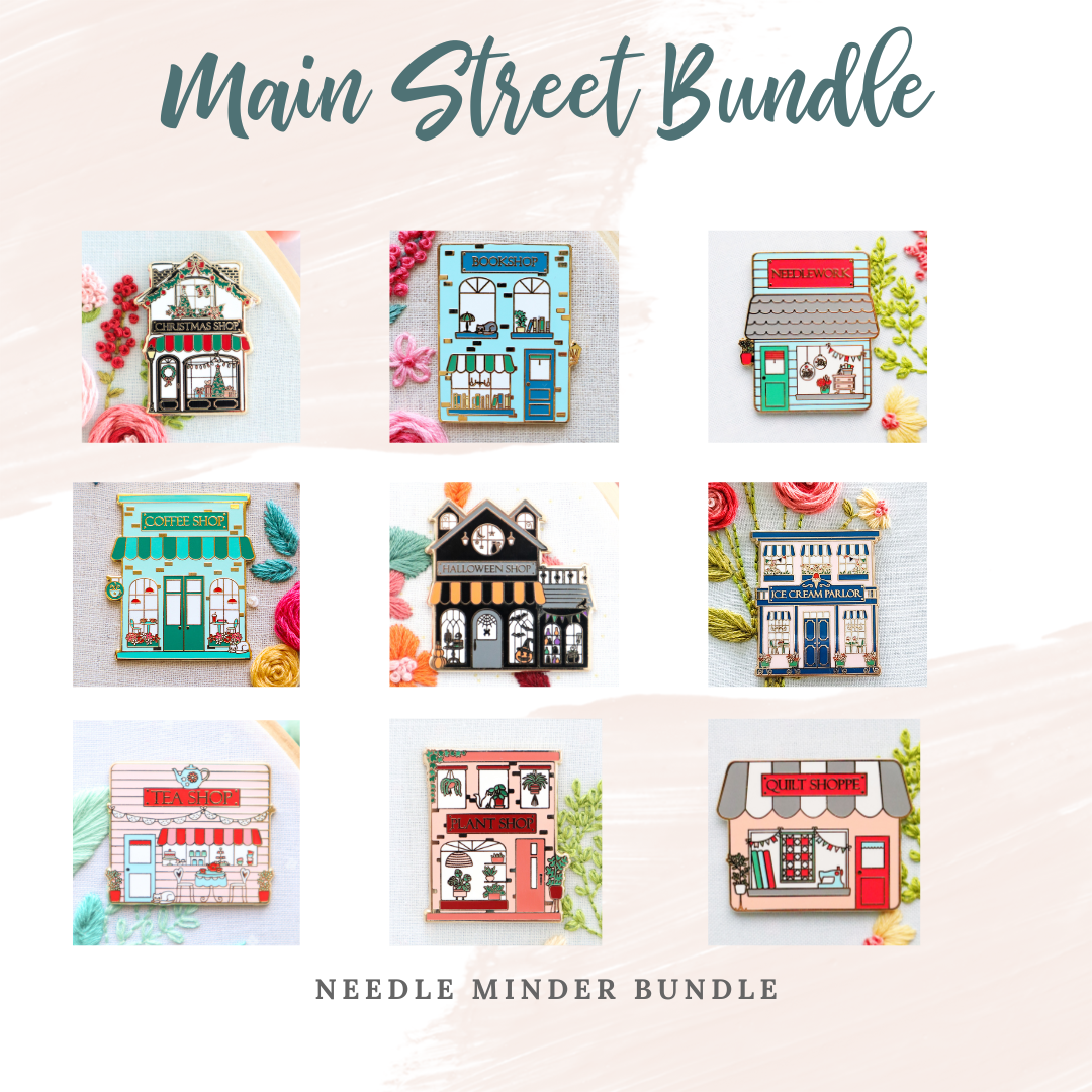 Step into a stitched stroll down Main Street with this Main Street Needle Minder Bundle! This special bundle includes all 15 Main Street–inspired needle minders, each one a tiny shop full of personality and charm—perfect for adding a whimsical, village feel to your embroidery or cross stitch projects.