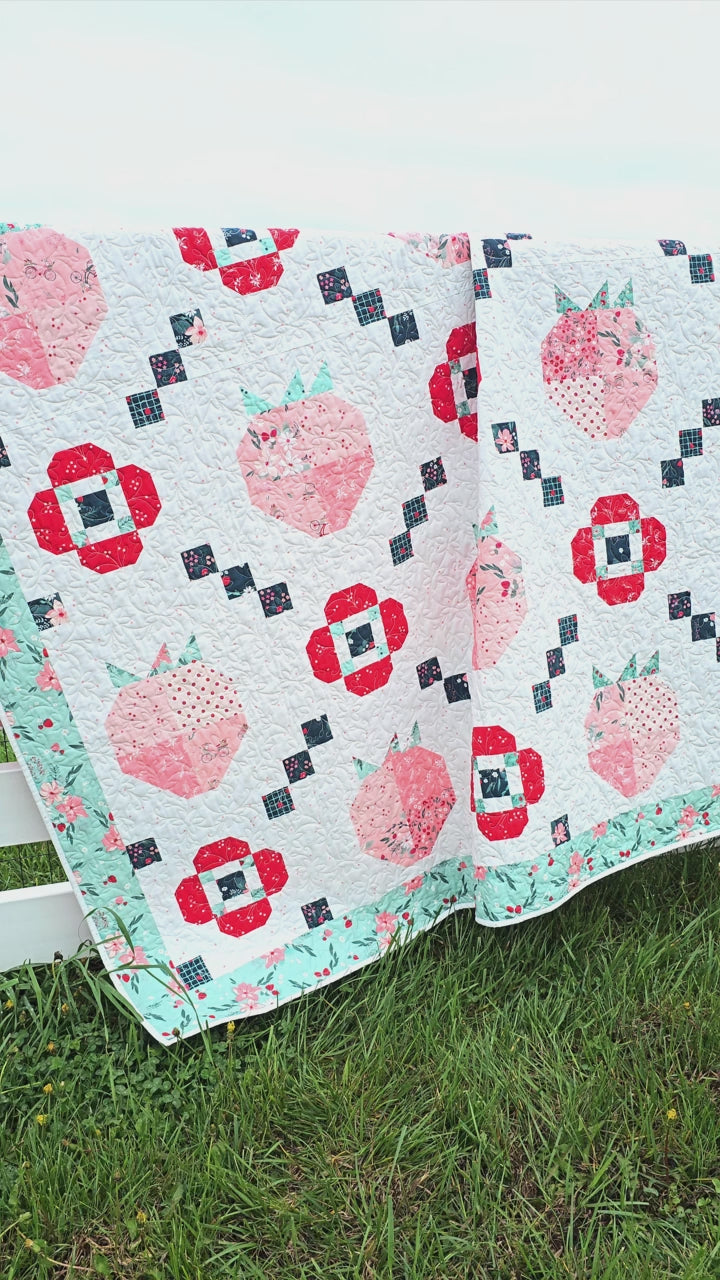 Get ready for berry season with this darling quilt! The Berry Market quilt is filled with sweet patchwork strawberries and flowers and it's so fast and fun to sew. The quilt looks fabulous with light or dark backgrounds too! The quilt is traditionally pieced.