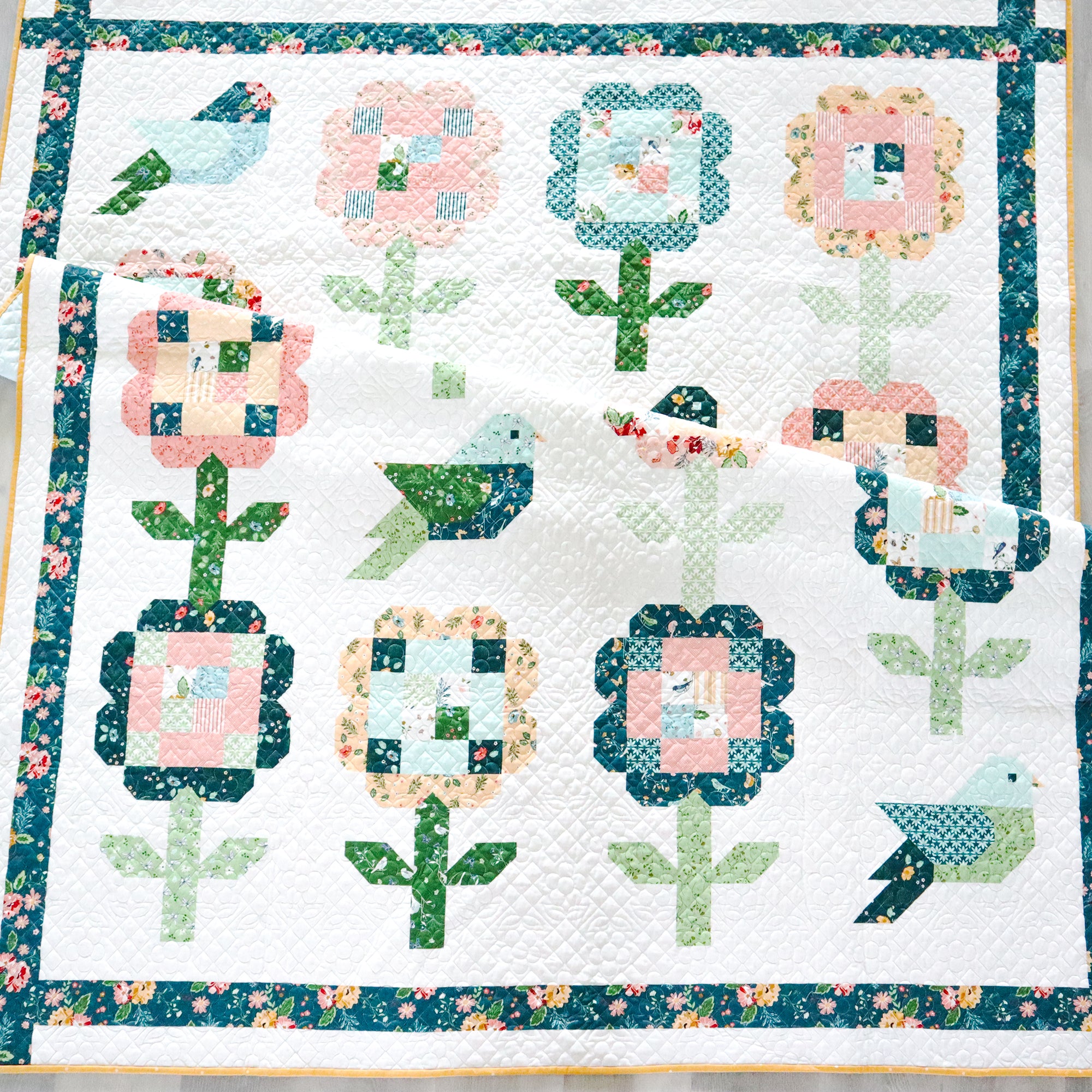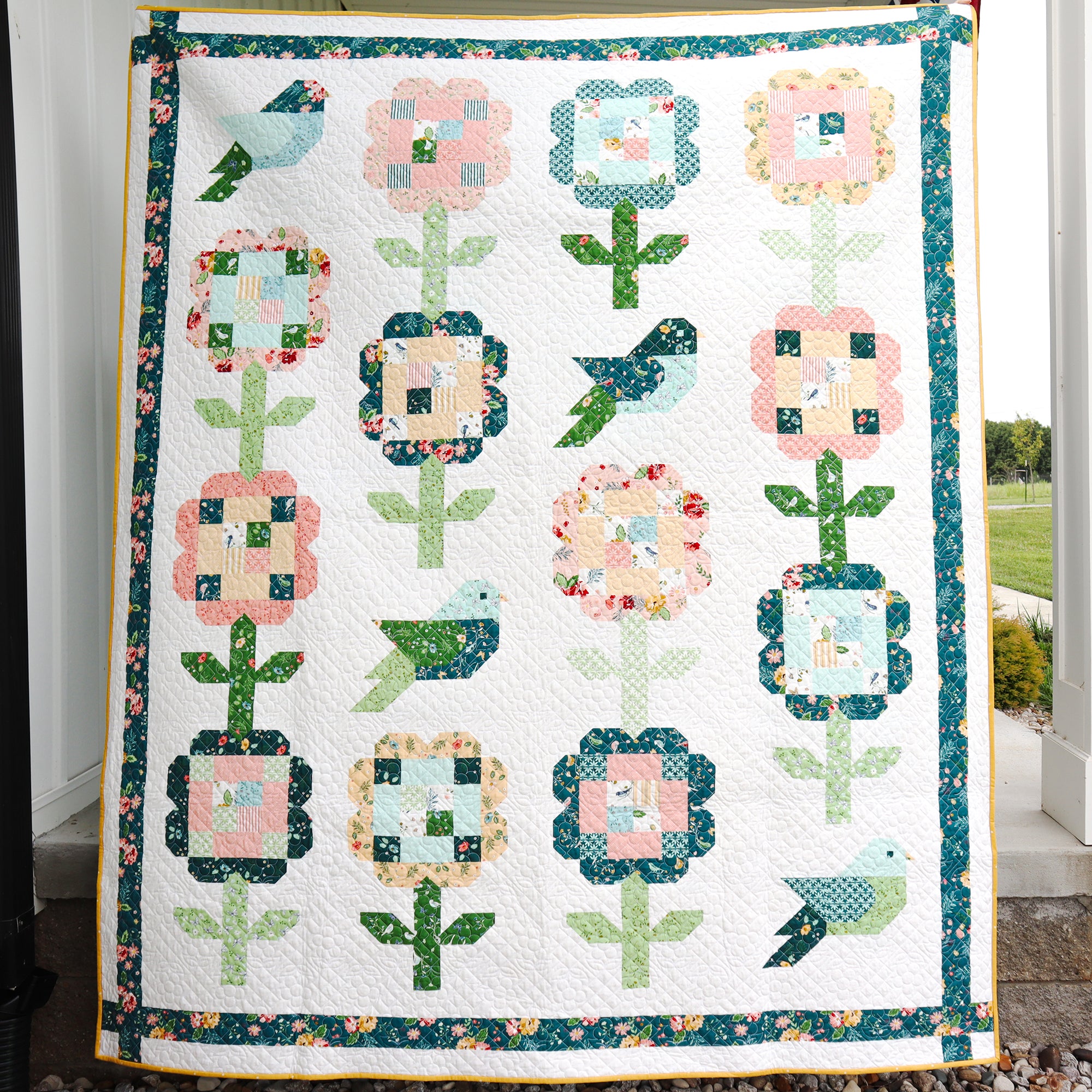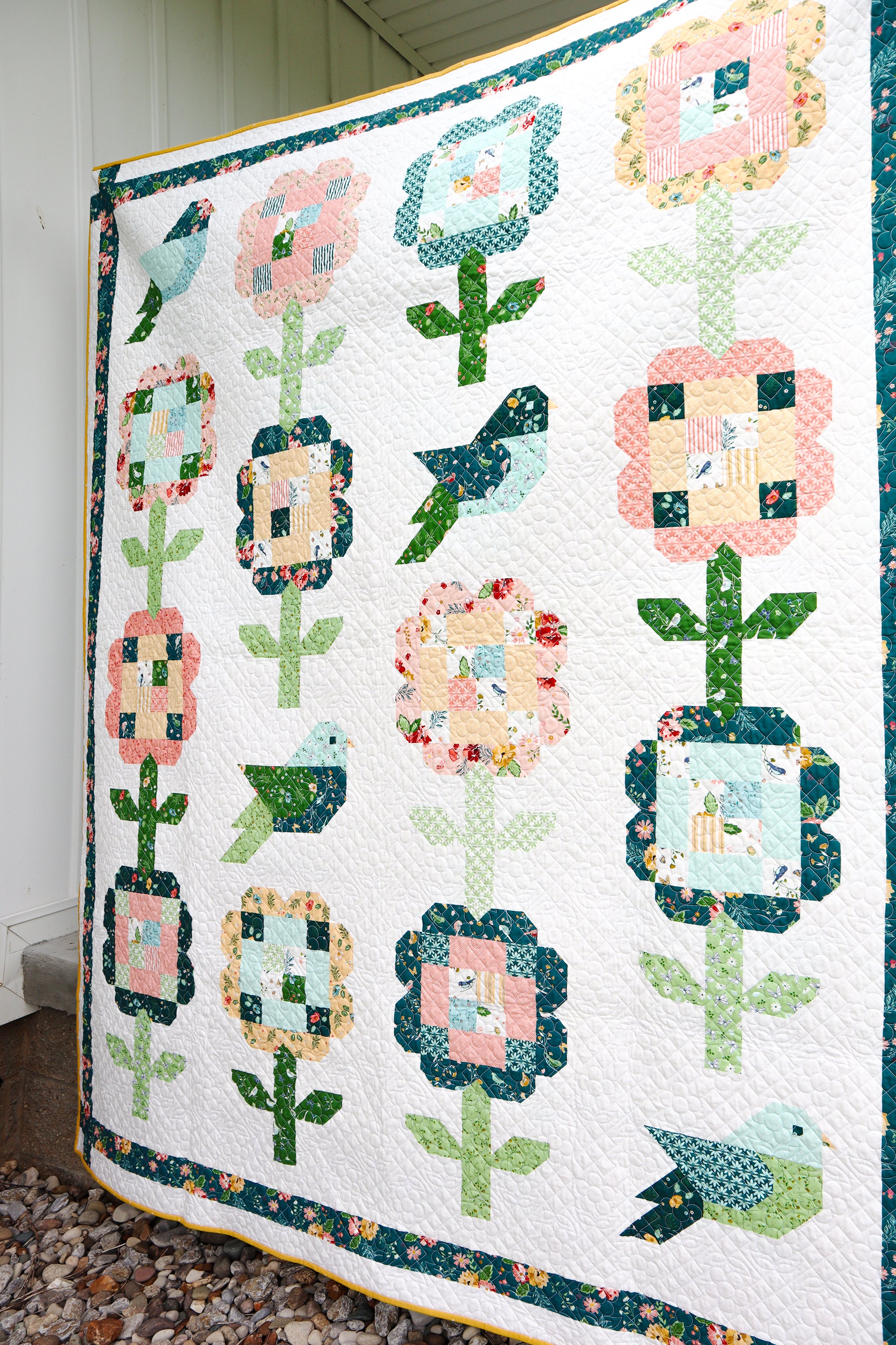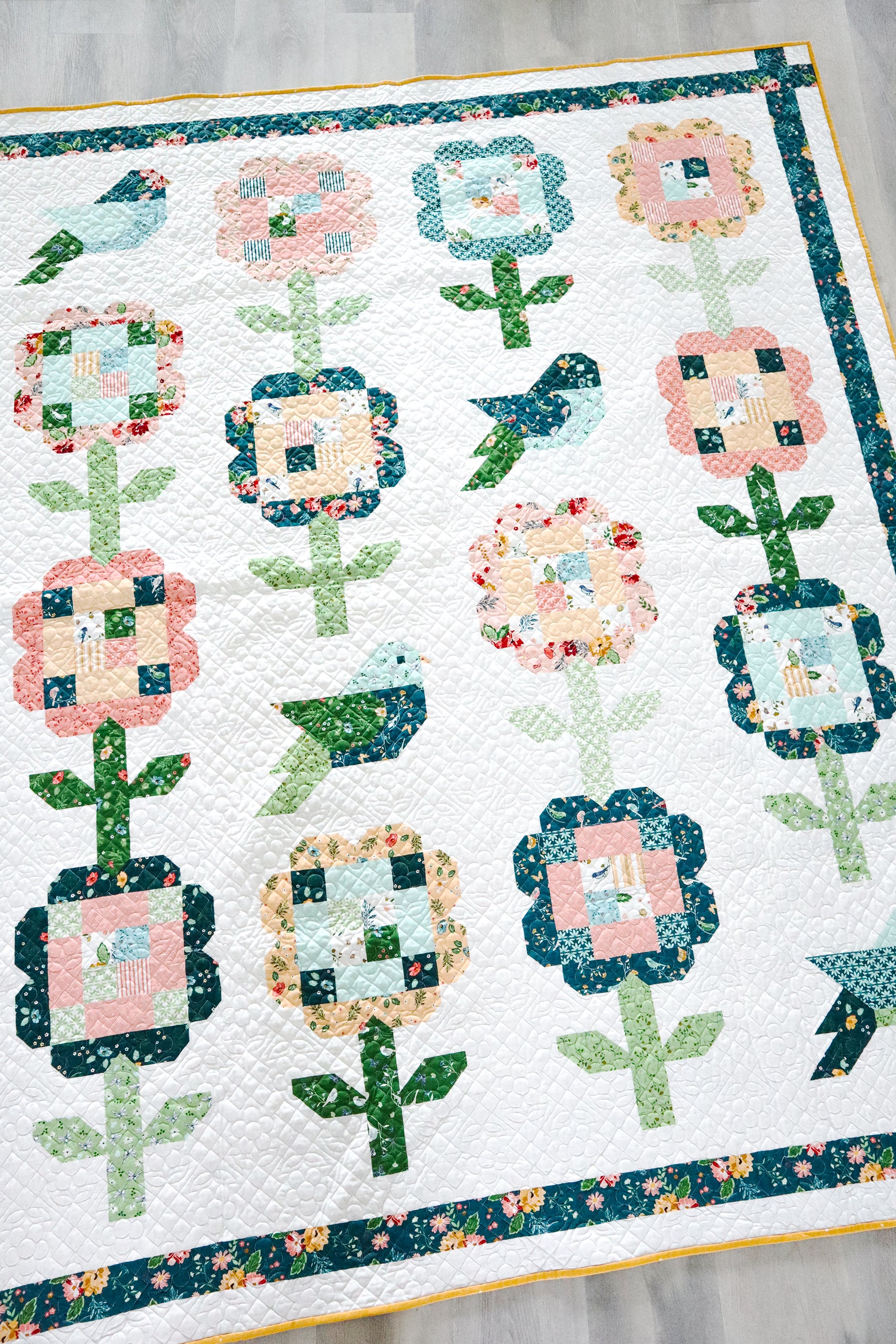 Songsparrow is a gorgeous quilt full of your favorite garden themes - blooming flowers and pretty birds! This quilt looks so pretty in my Melody fabrics for Riley Blake Designs, out in September 2024. The quilt is fat quarter friendly and finishes at 72" x 88".