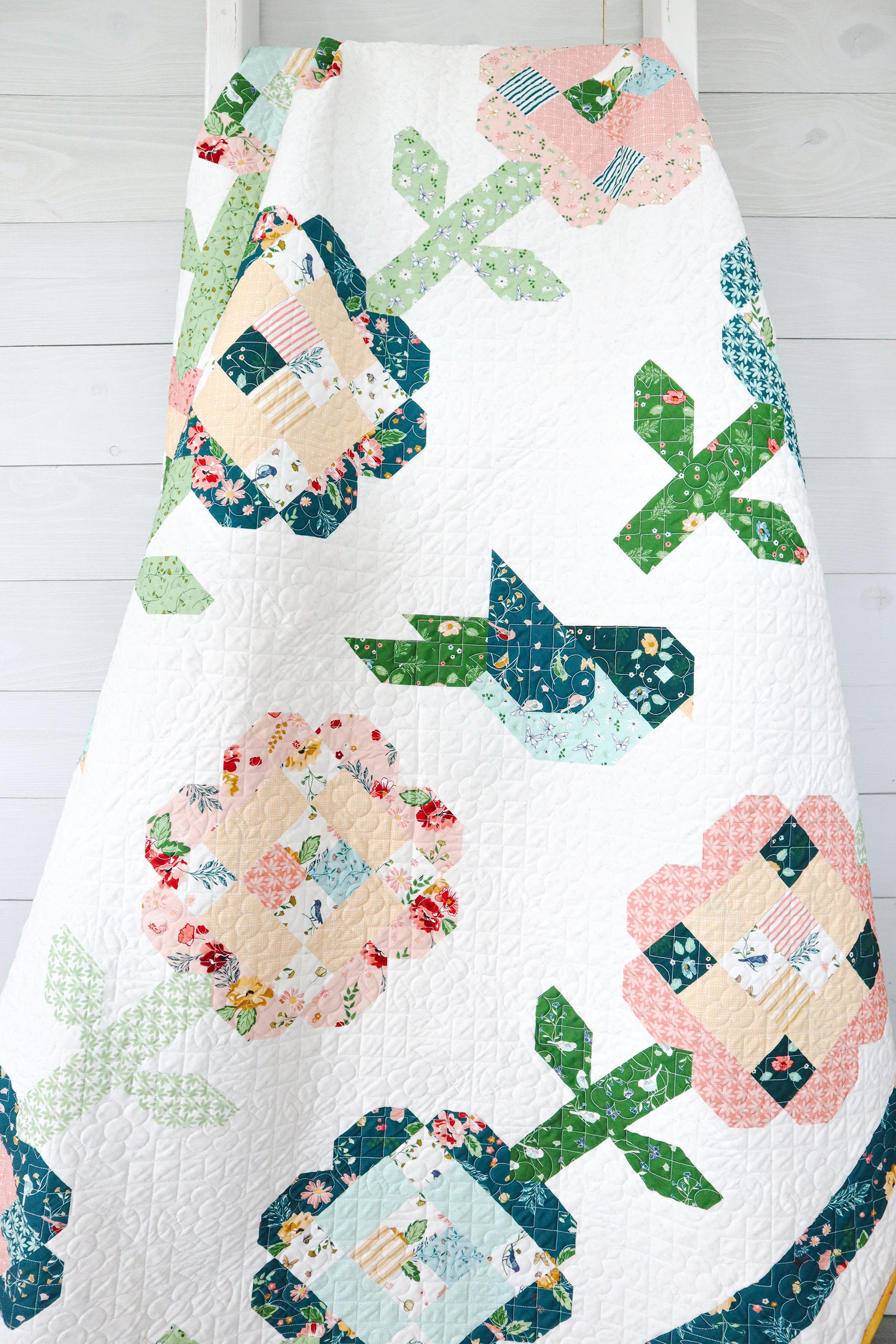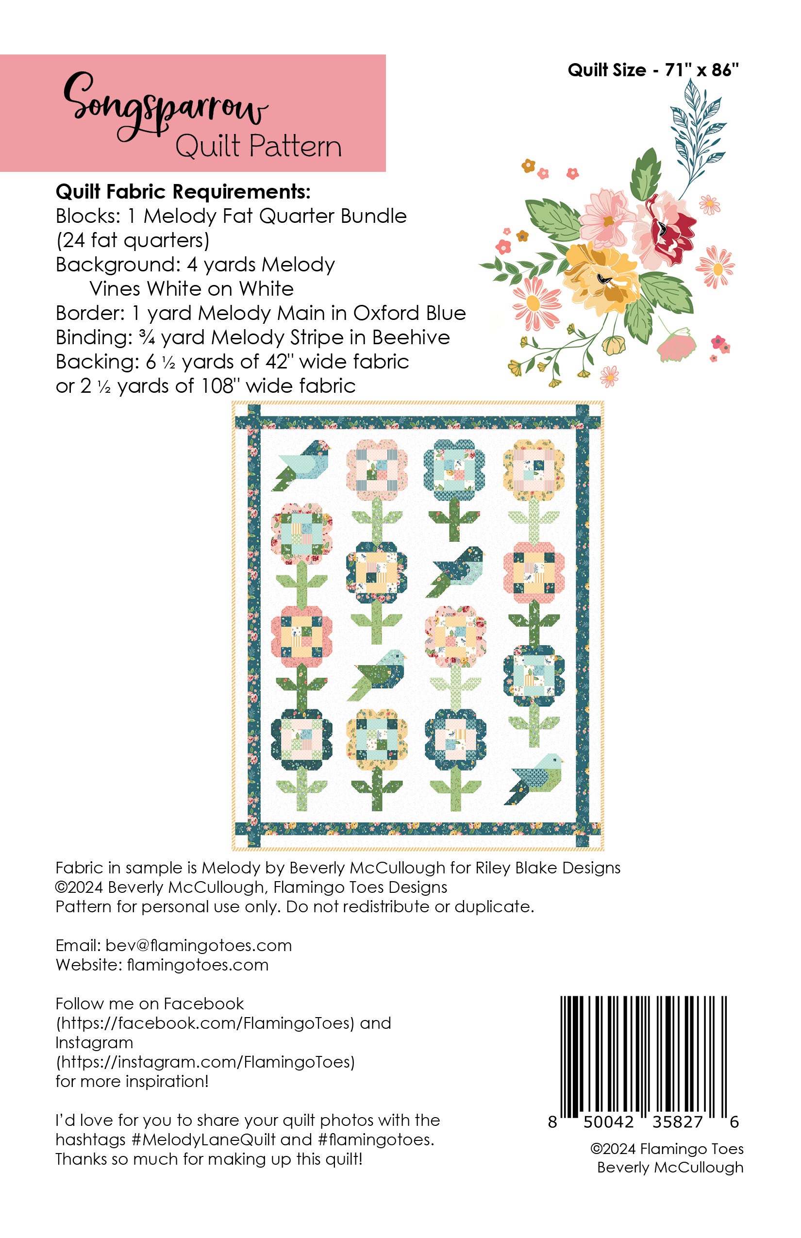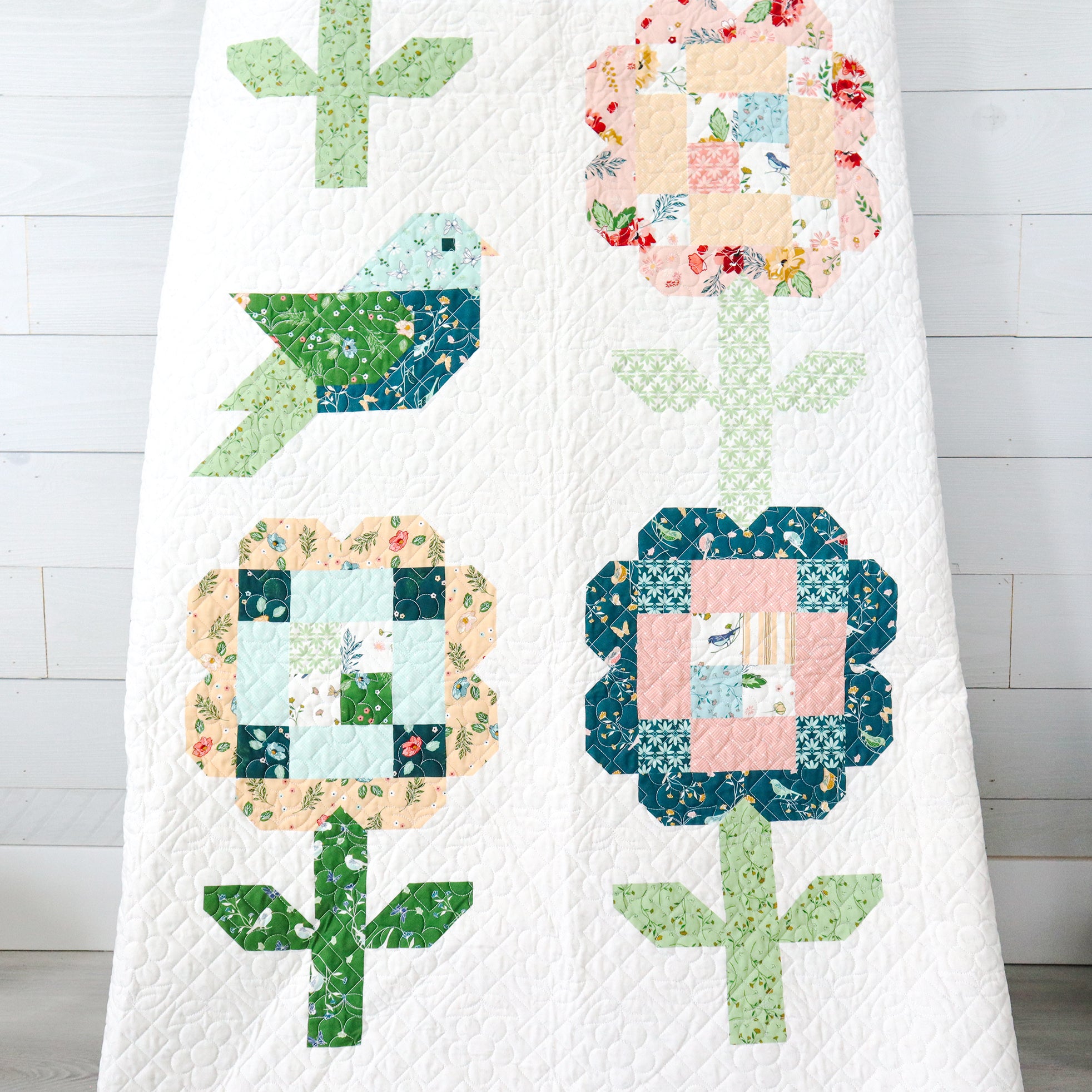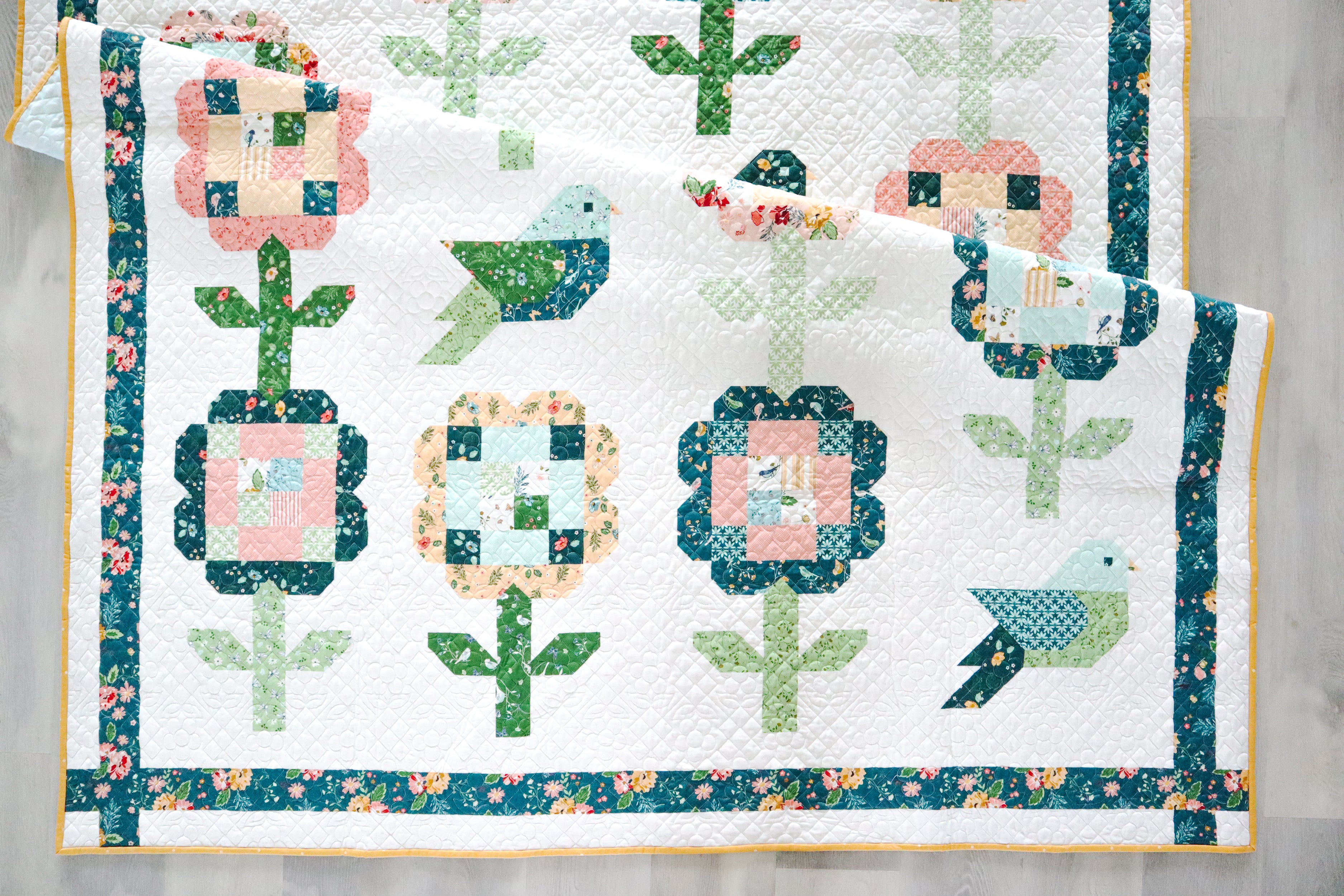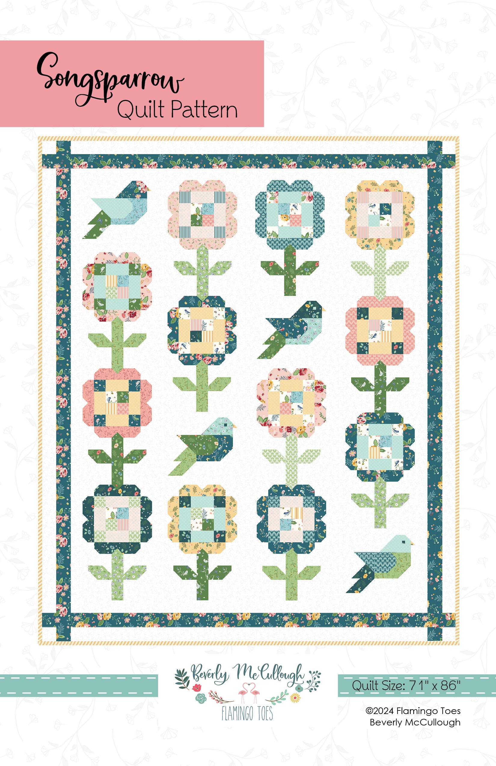 Songsparrow is a gorgeous quilt full of your favorite garden themes - blooming flowers and pretty birds! This quilt looks so pretty in my Melody fabrics for Riley Blake Designs, out in September 2024. The quilt is fat quarter friendly and finishes at 72" x 88".