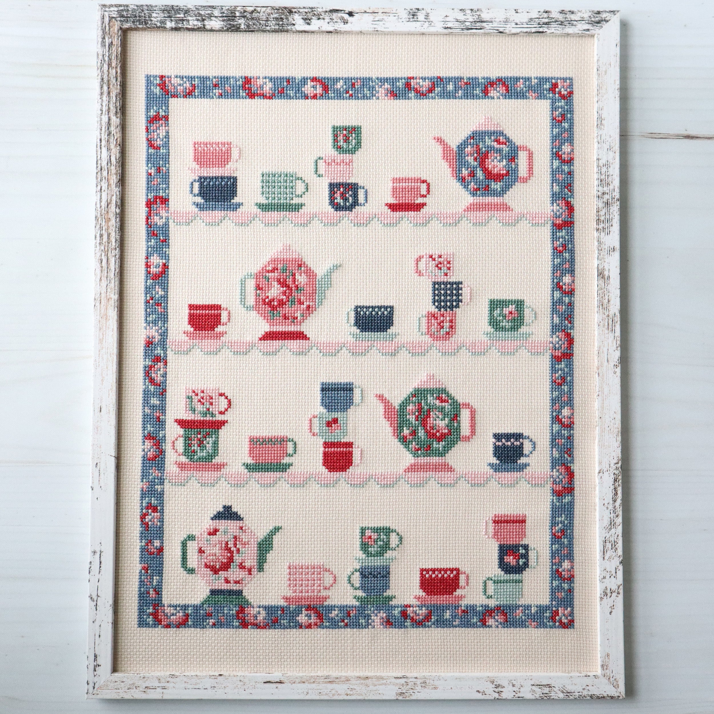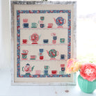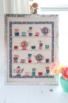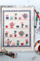 It's time for a Tea Party! This cross stitch chart is a sweet version of my Tea Party Quilt with tiny teacups and teapots all on little shelves. It's such a fun stitch!