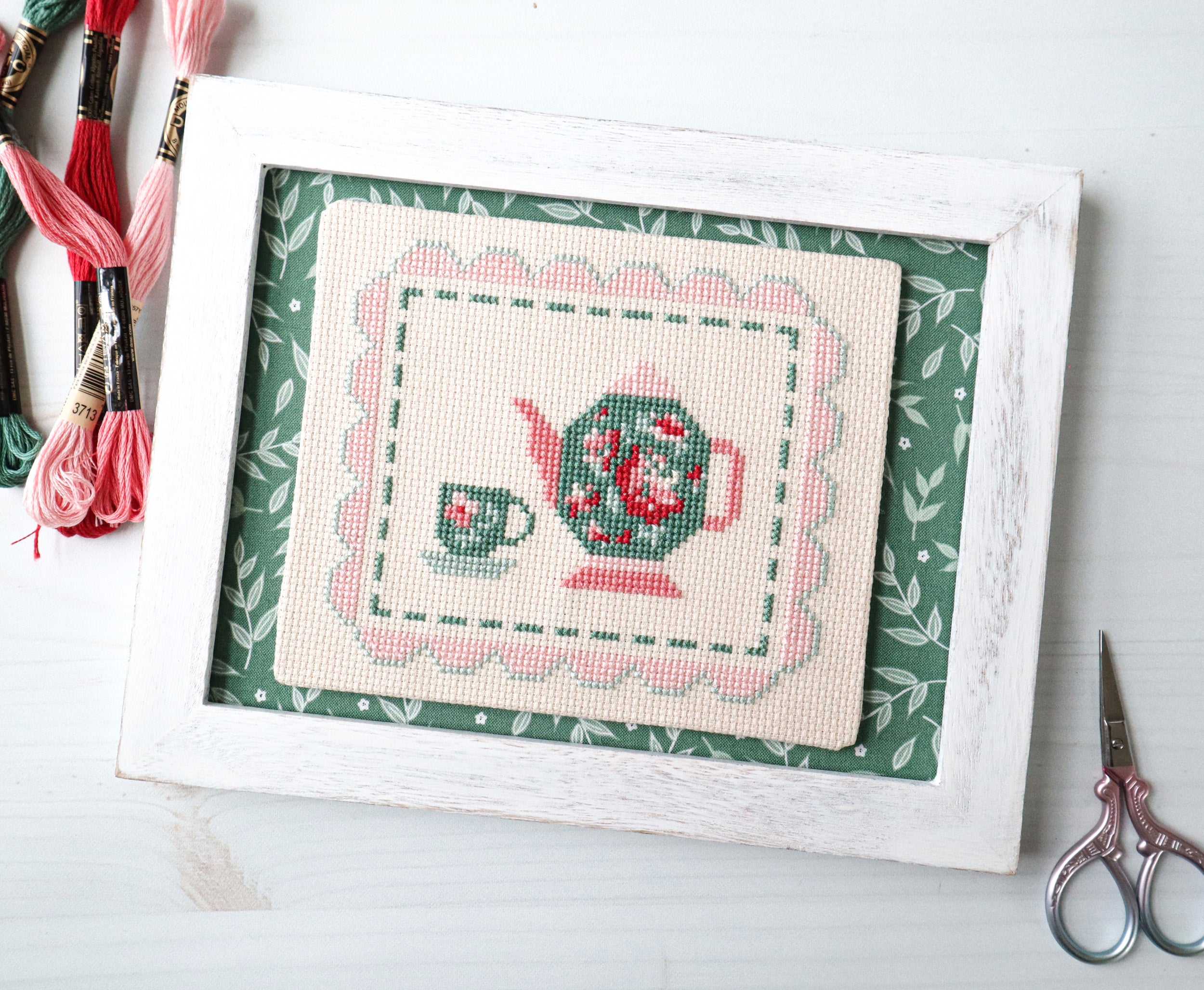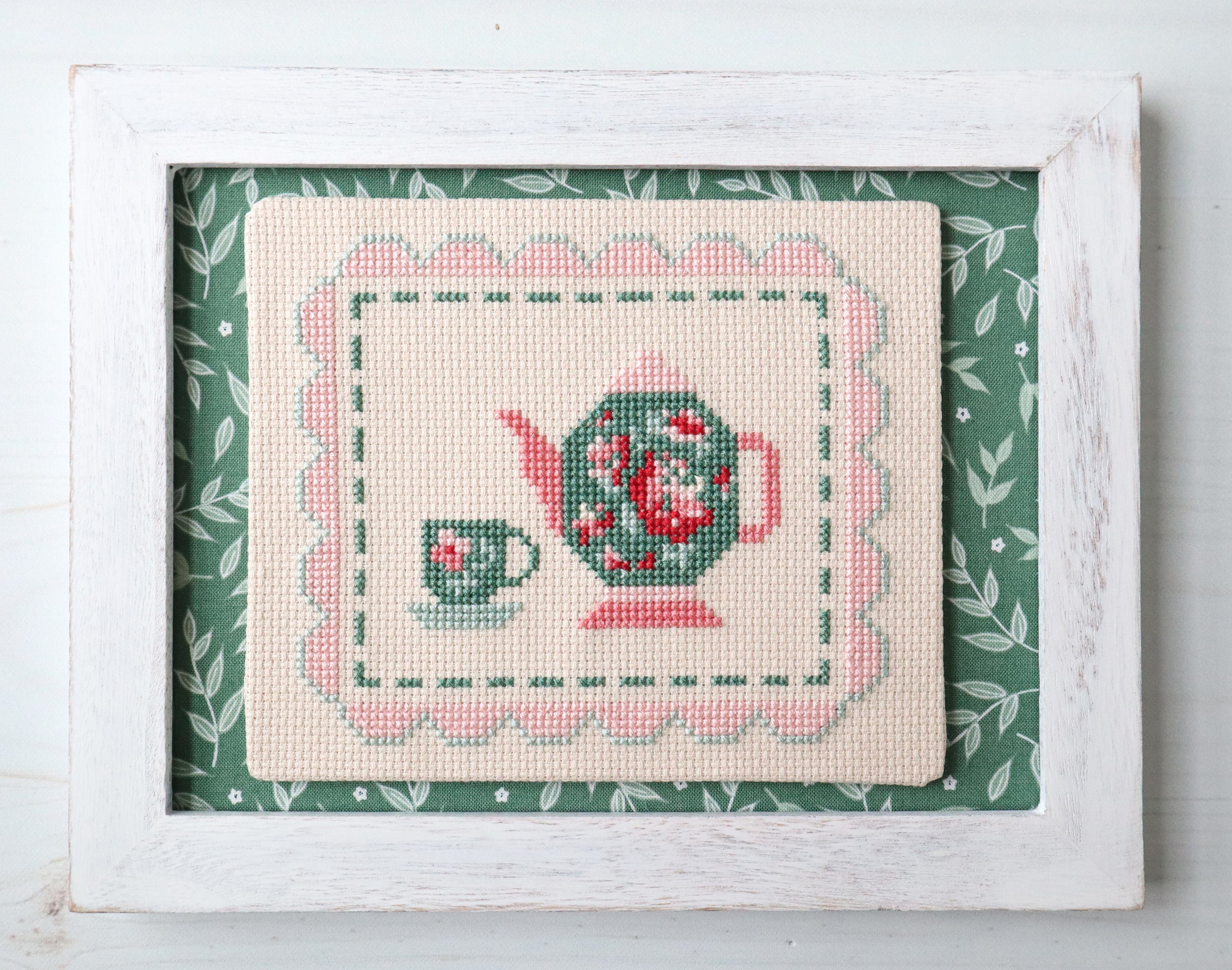 Framed in a 6” x 8” frame with fabric from the Afternoon Tea Fabric collection as a background. The stitched portion is on a 5” x 6” backing piece.