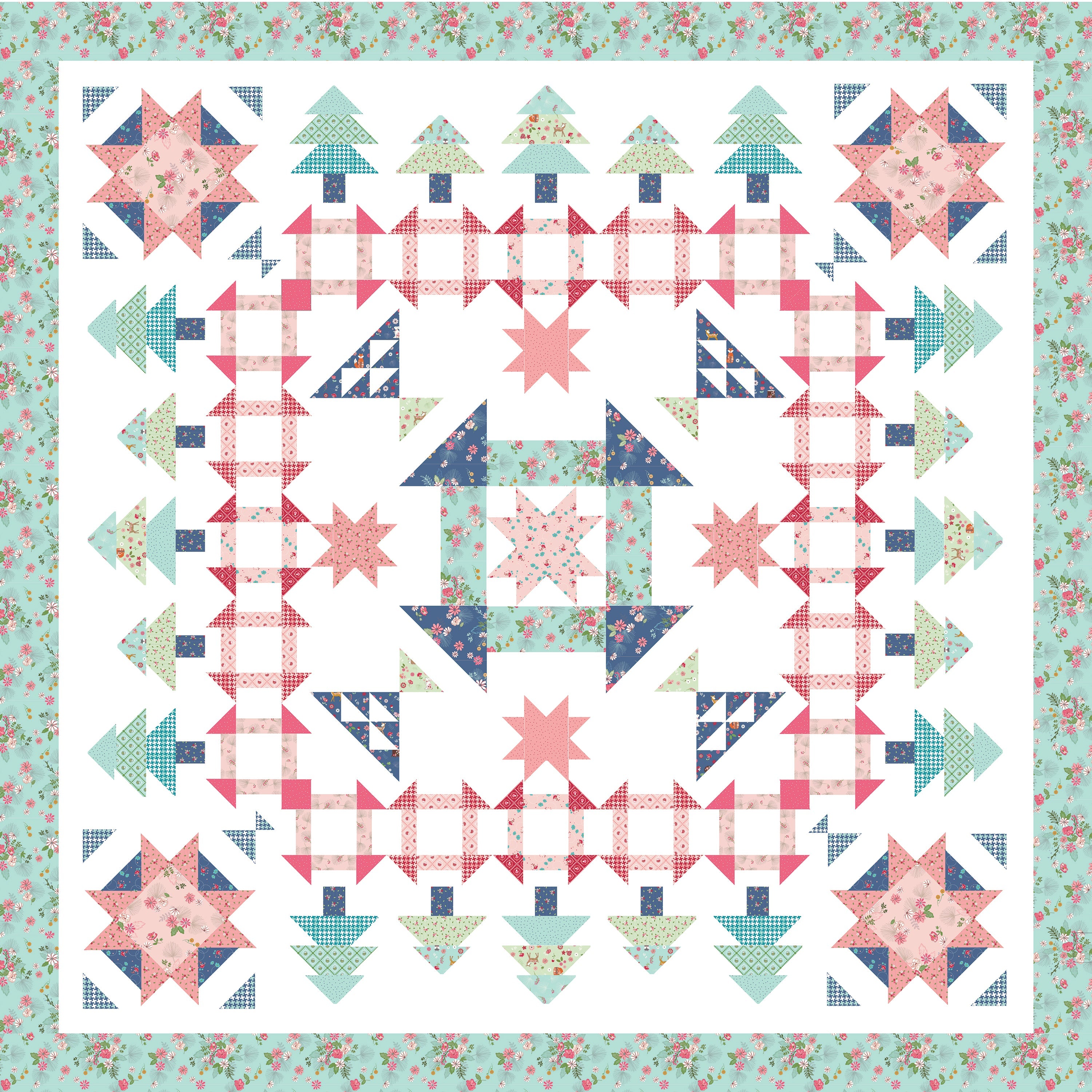 A Walk in the Woods Quilt Pattern is a sweet combination of churn dash blocks, star blocks, and pretty little tree blocks! It looks so great made up in the Enchanted Meadow fabric collection as shown, but it would look fabulous in any fabric! It is precut friendly and so much fun to sew up!