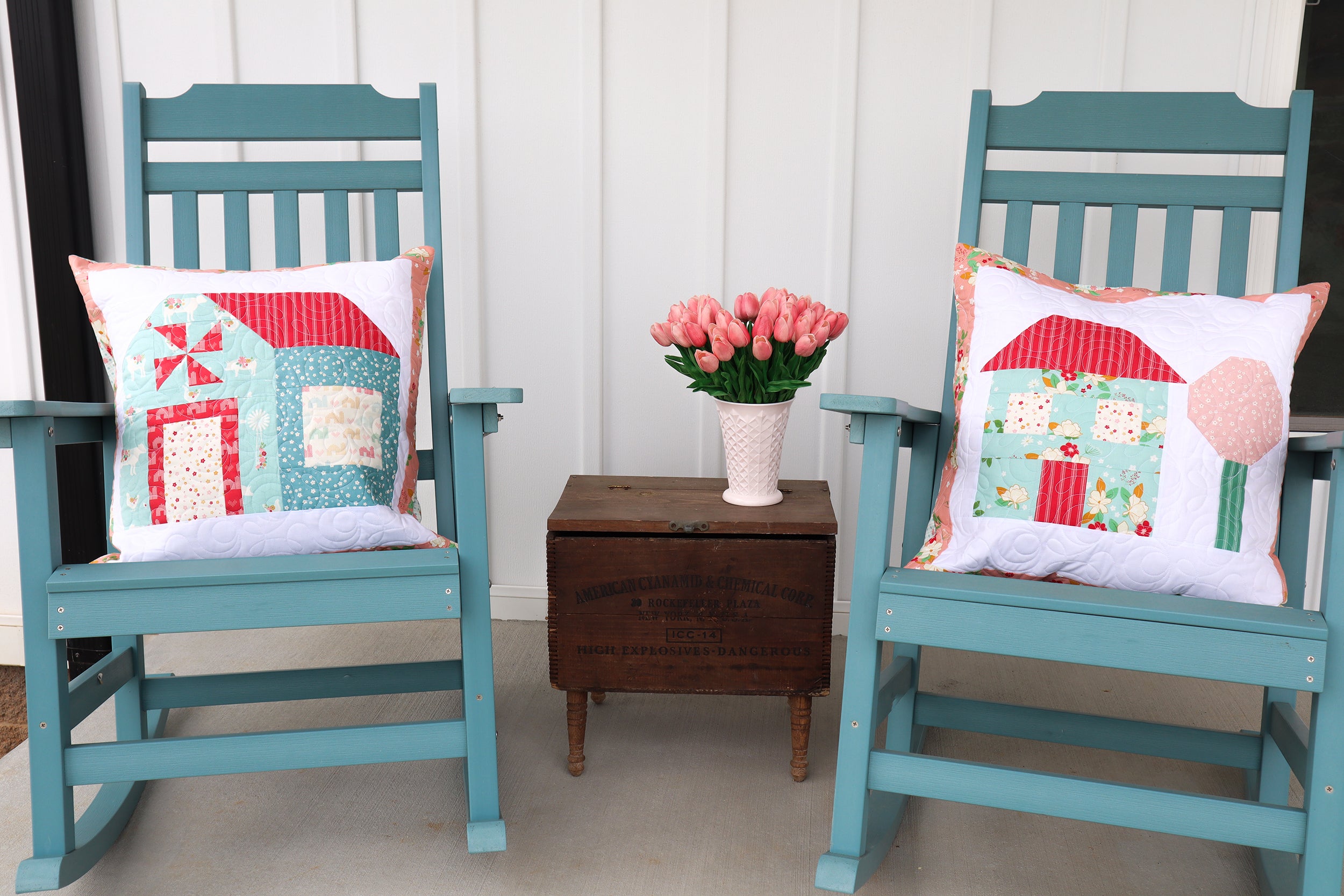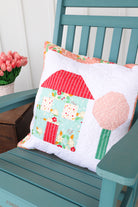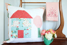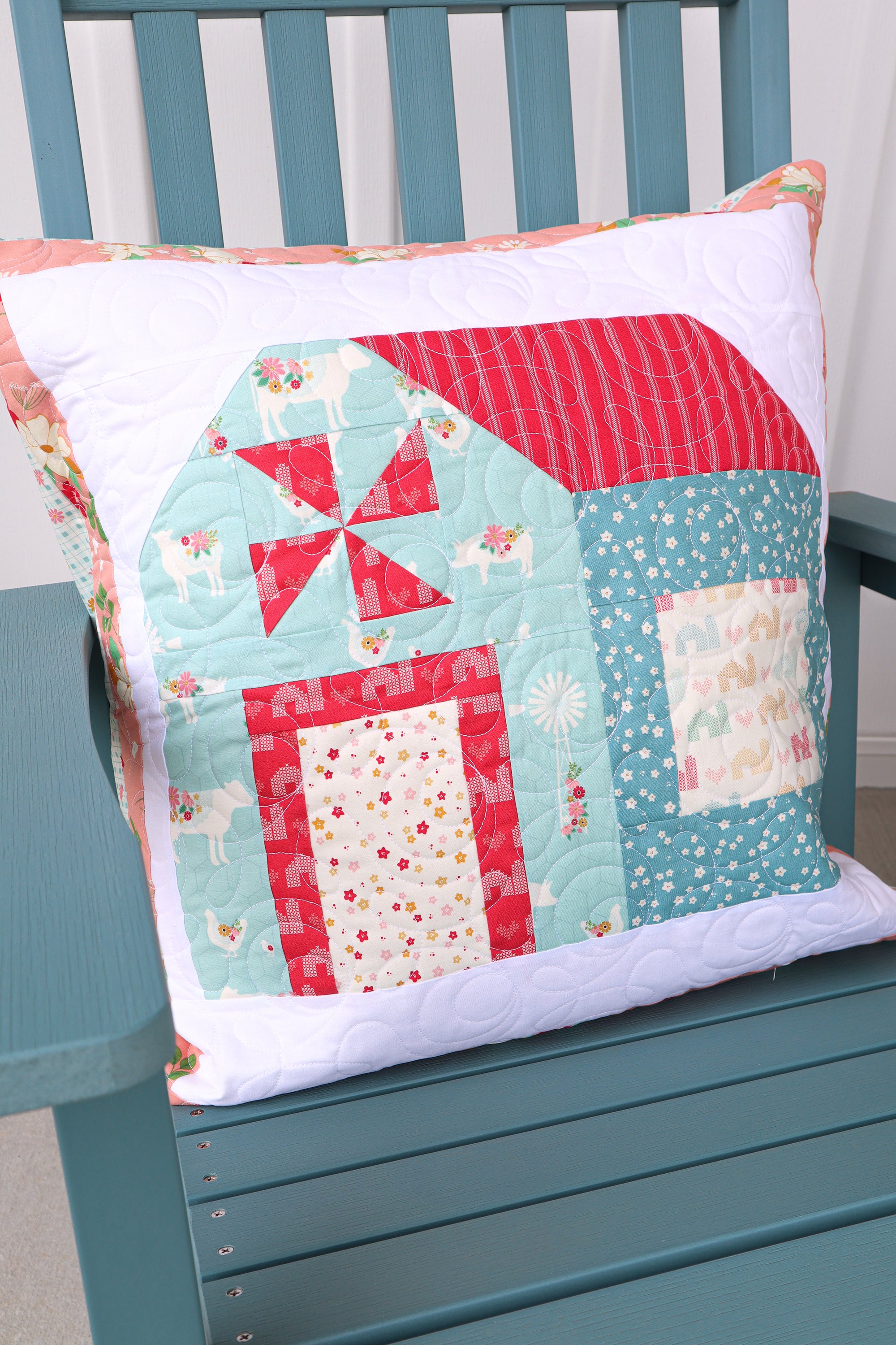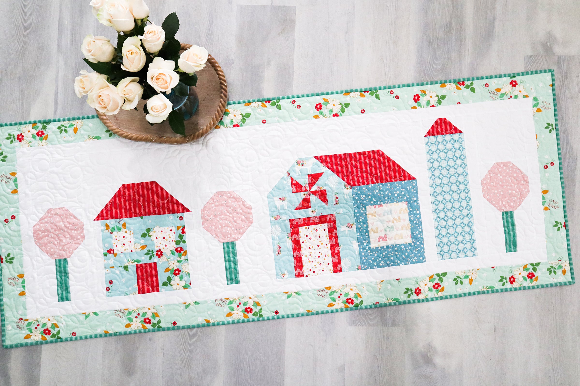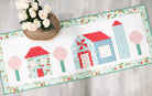 The Homestead pattern includes a table runner with a cute house, barn and silo. The two coordinating pillows are patterns for the house and the barn.