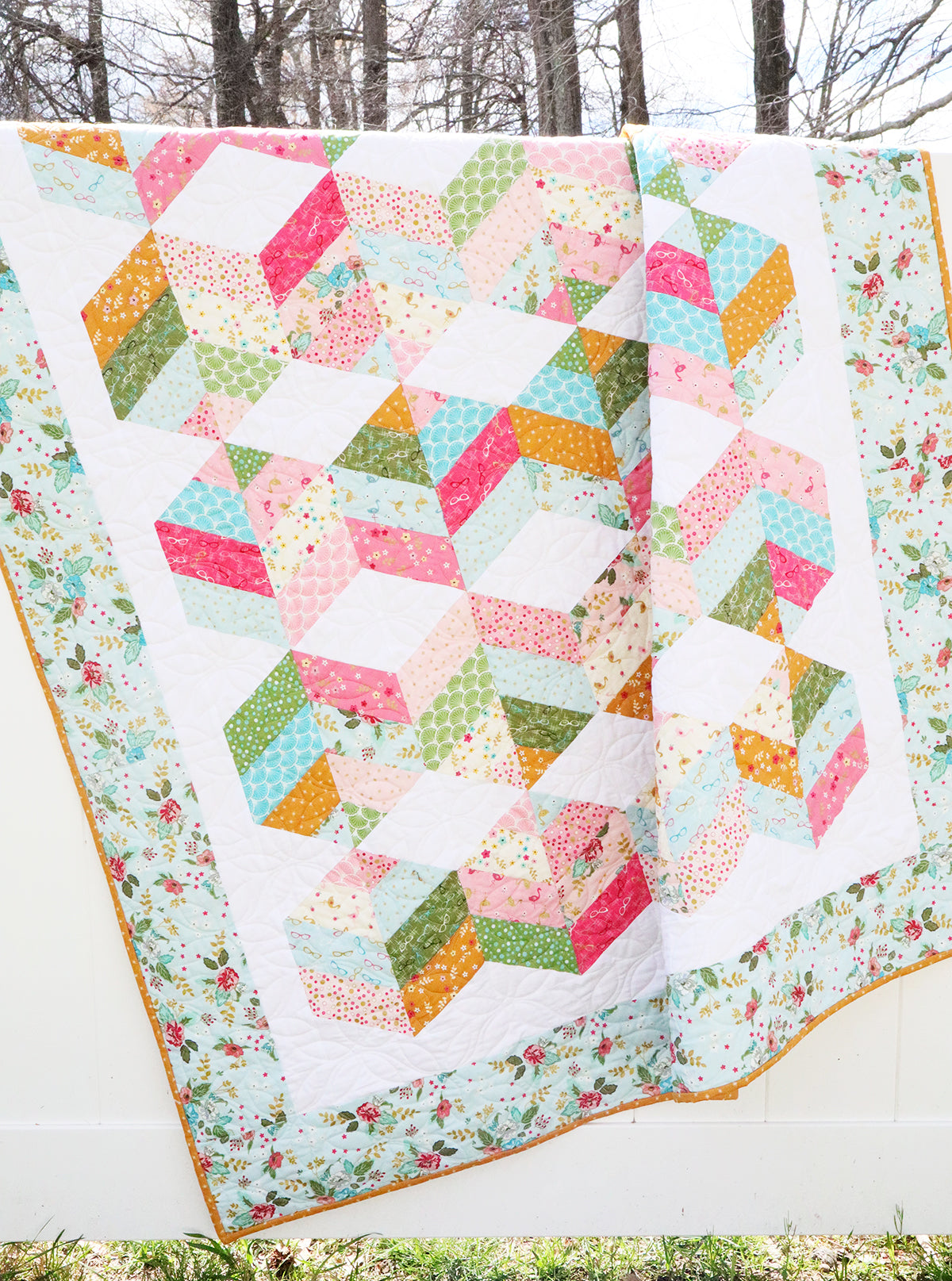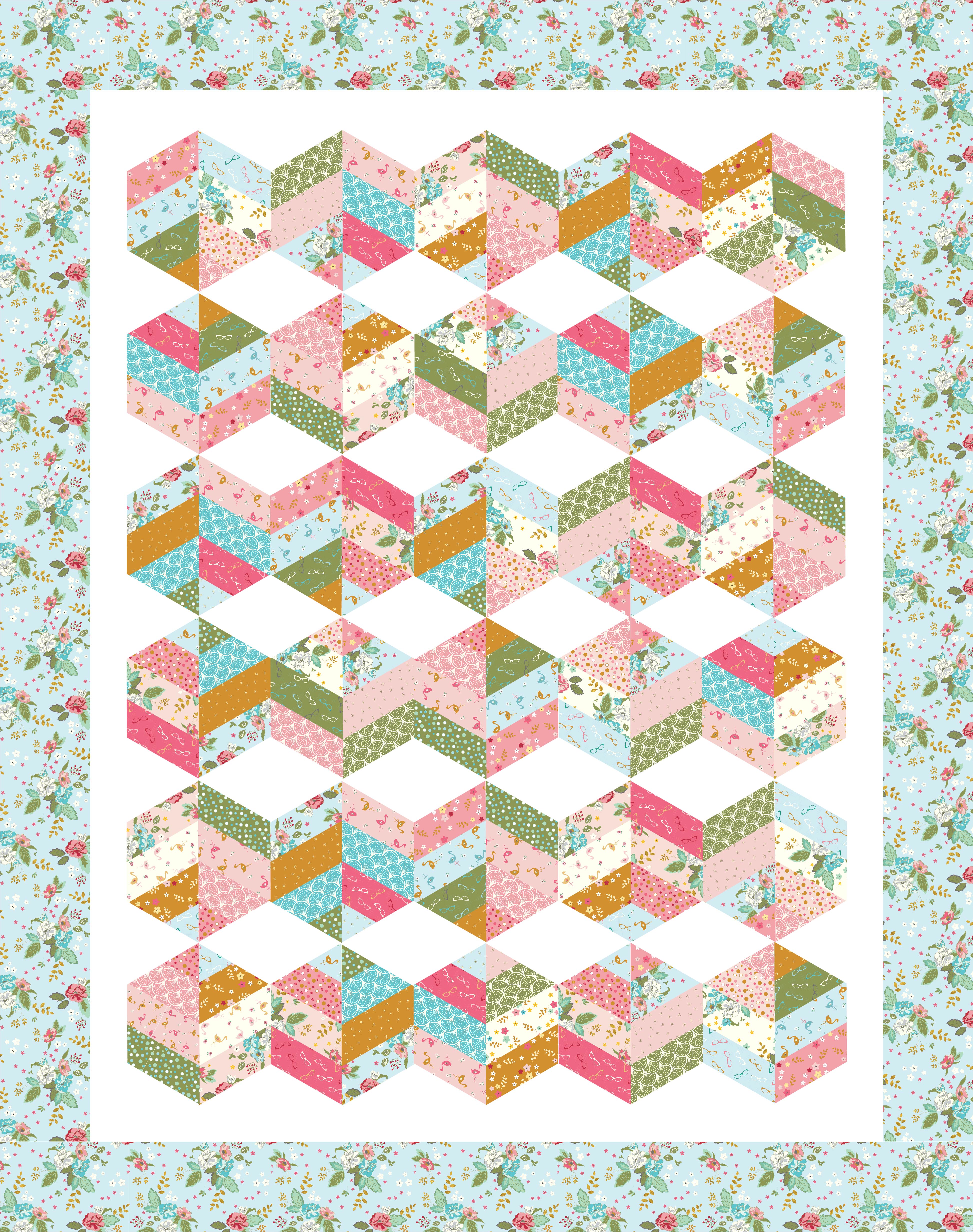 This quilt uses my acrylic templates to make cutting this quilt even simpler. The pattern also comes with paper patterns for easy cutting. You can find the acrylic versions here: https://flamingotoesshop.com/collections/notions/products/half-hexie-and-triangle-template-set