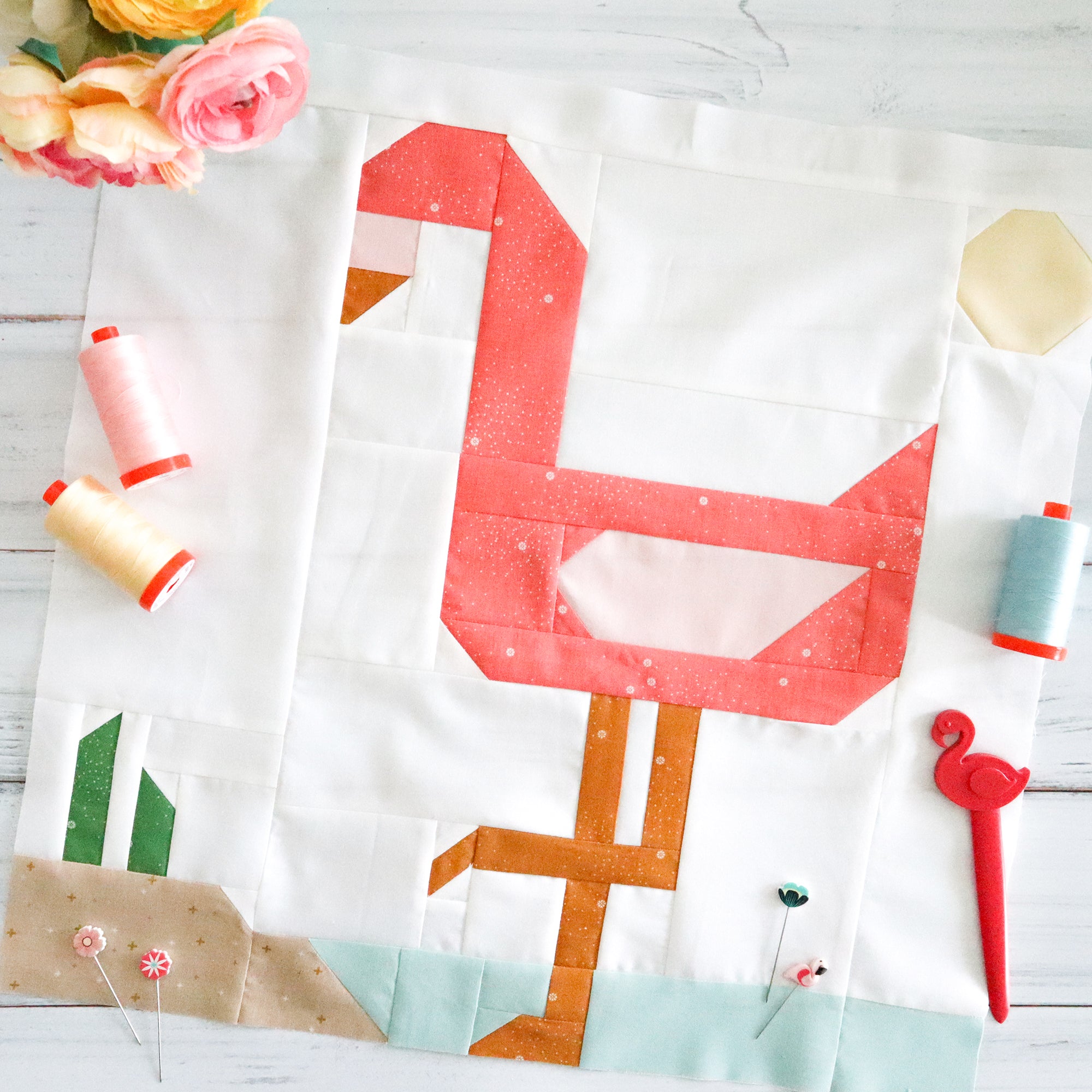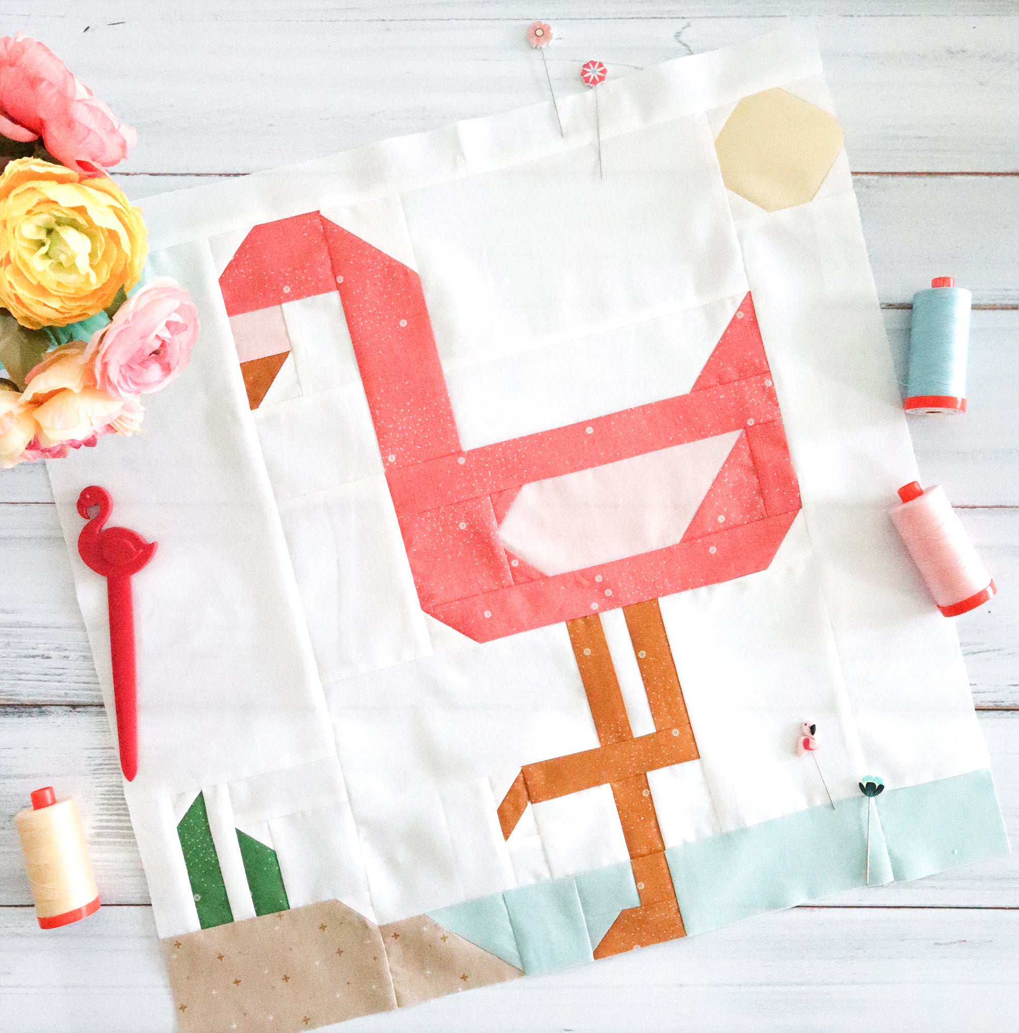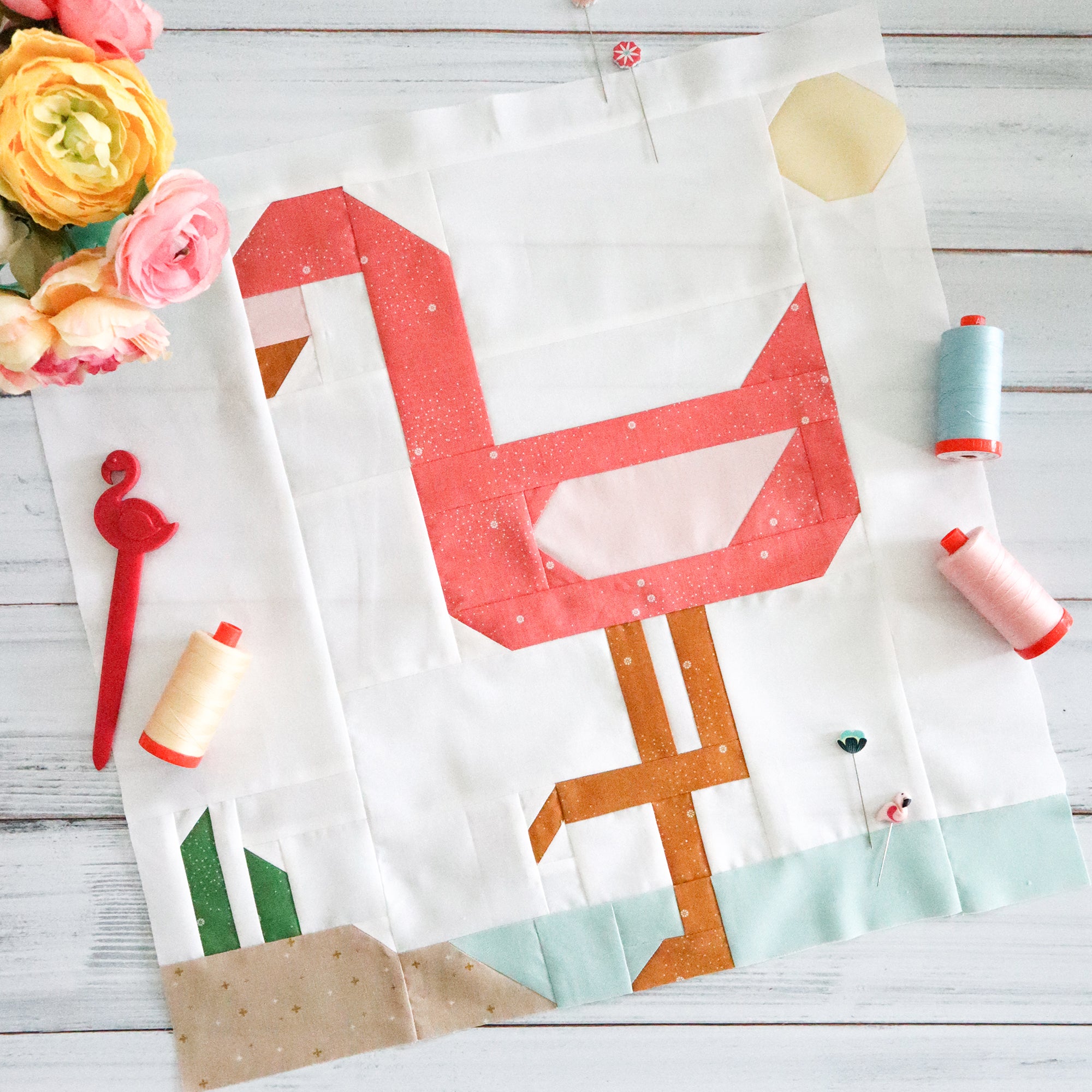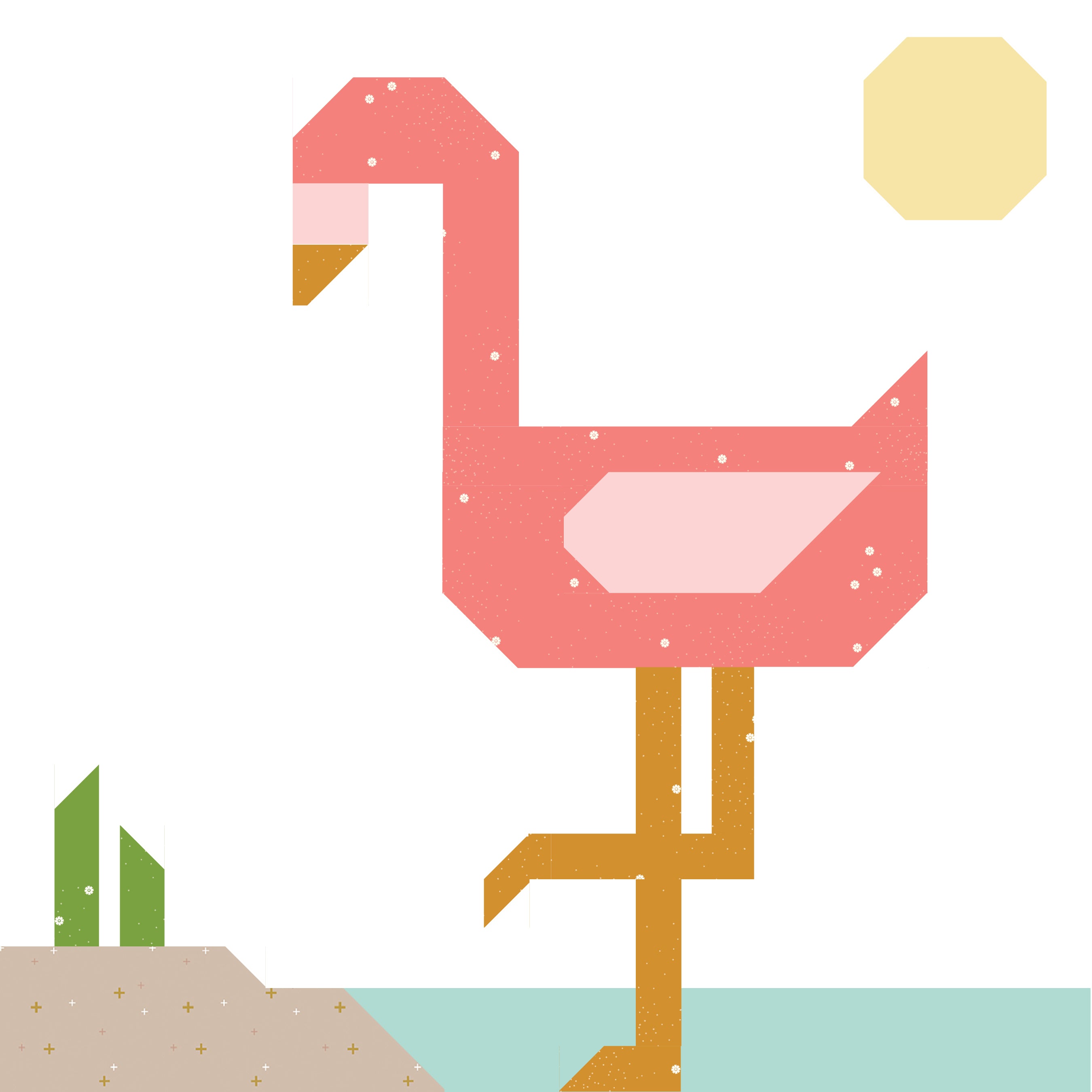 This bright and cheery Flamingo quilt block will have you dreaming of sunny days by the water! It’s the perfect design to bring a tropical touch to a quilt, pillow, bag or other project.  Fun, fresh, and fabulous—just like a flamingo should be!