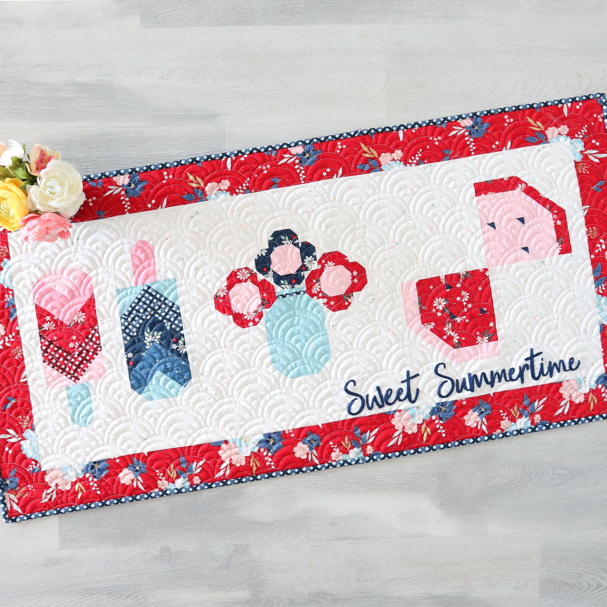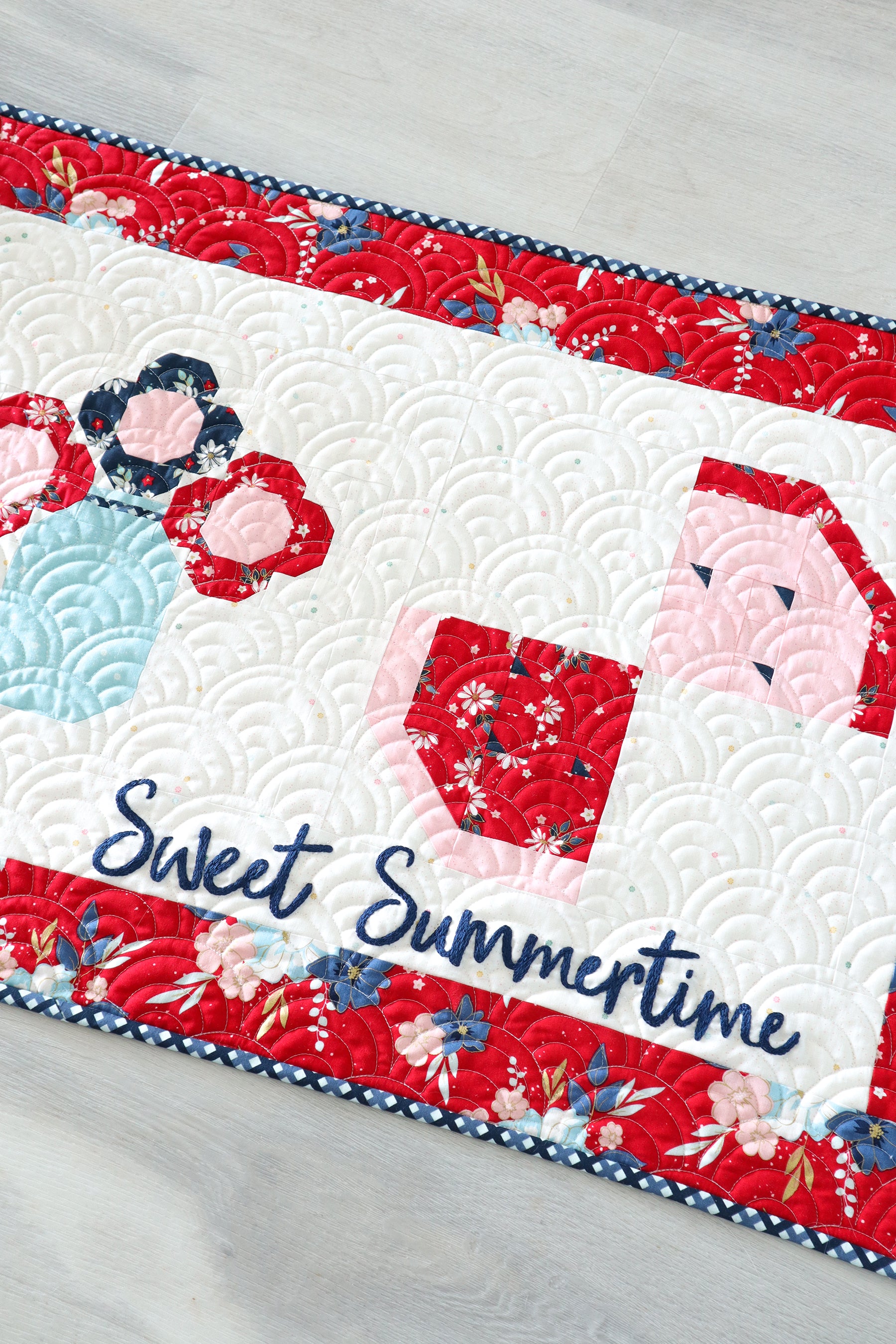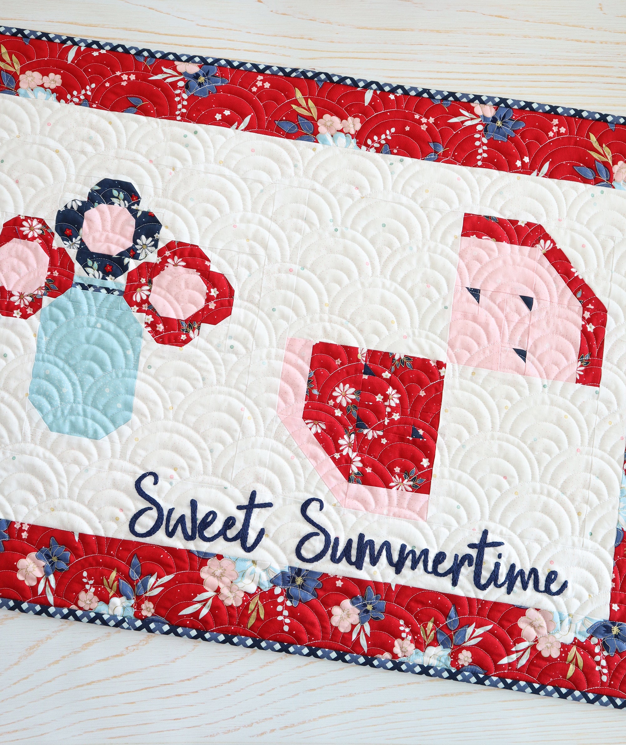 Choose your favorite 12" blocks and sew up this great Sweet Summertime Runner Pattern. A little bit of embroidery adds even more fun to the runner.