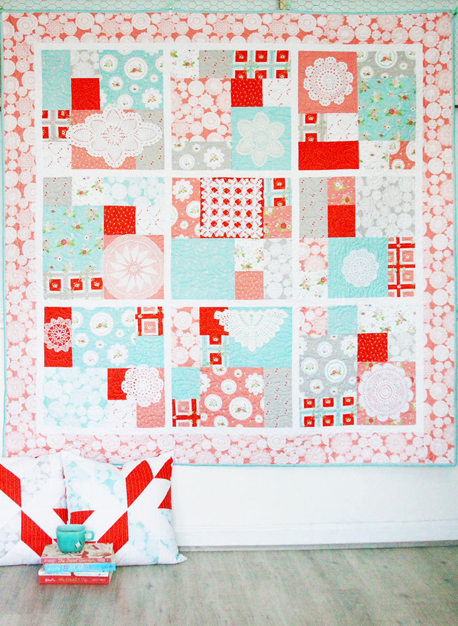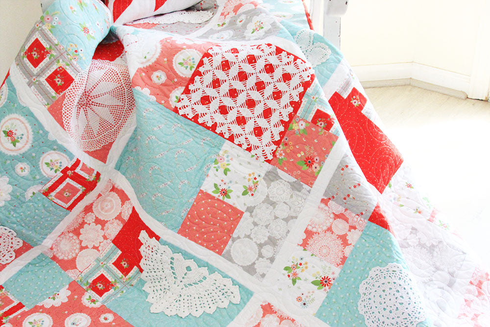 This quilt is such a fun way to show off your fabrics and some vintage doilies all at the same time! The design is perfect for 10" stackers (layer cakes) and the colorful patchwork look that would be a great way to show off a favorite fabric collection too!