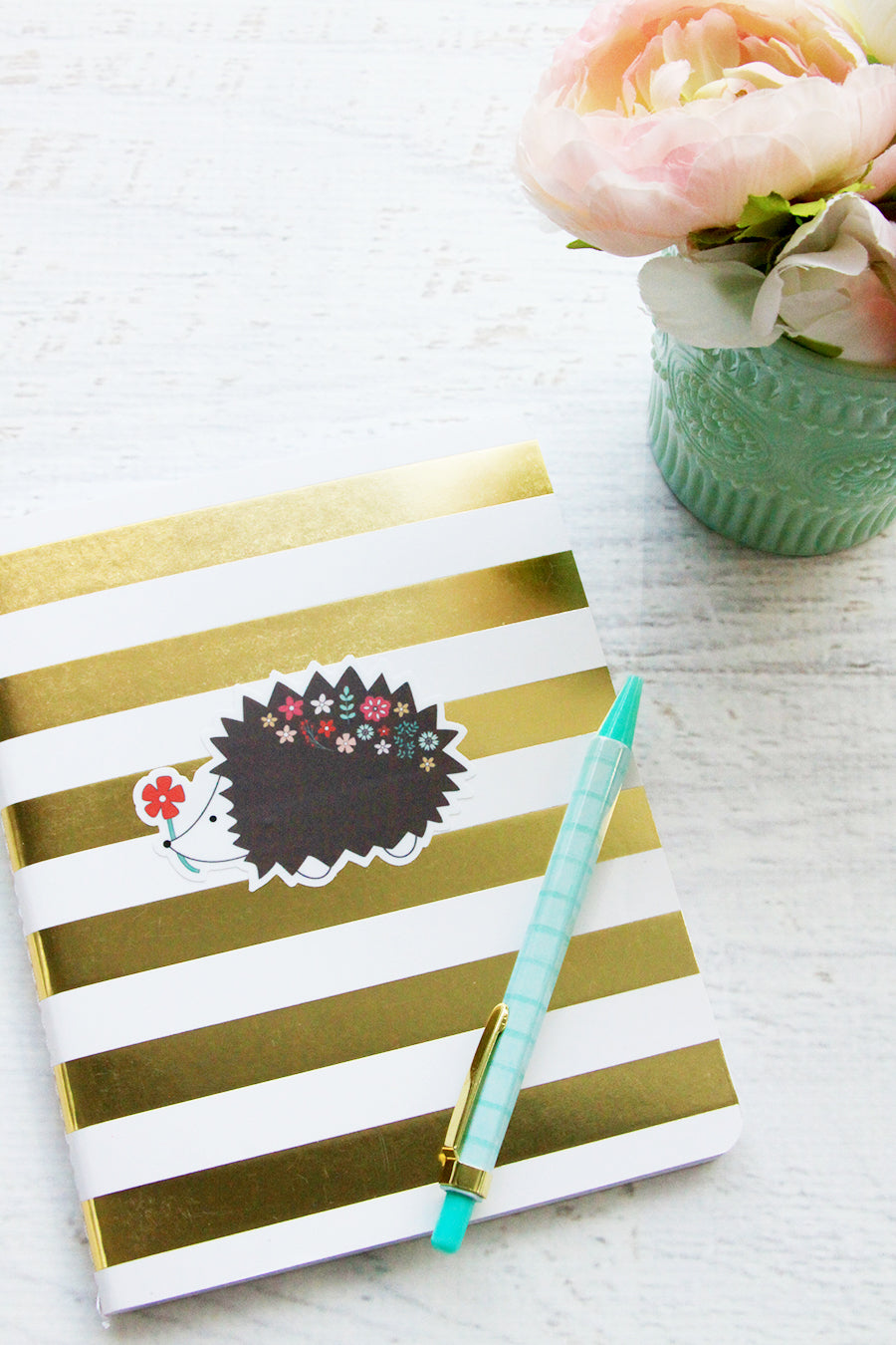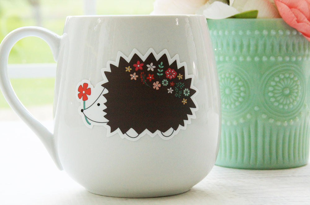 Size is 3" x 3". Order includes one floral hedgehog vinyl sticker. Sale only includes sticker, planner and mug are not included.