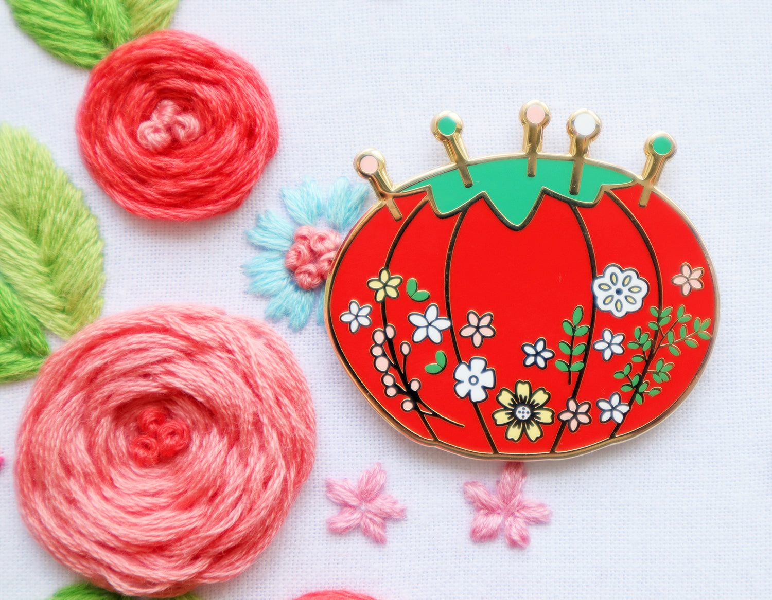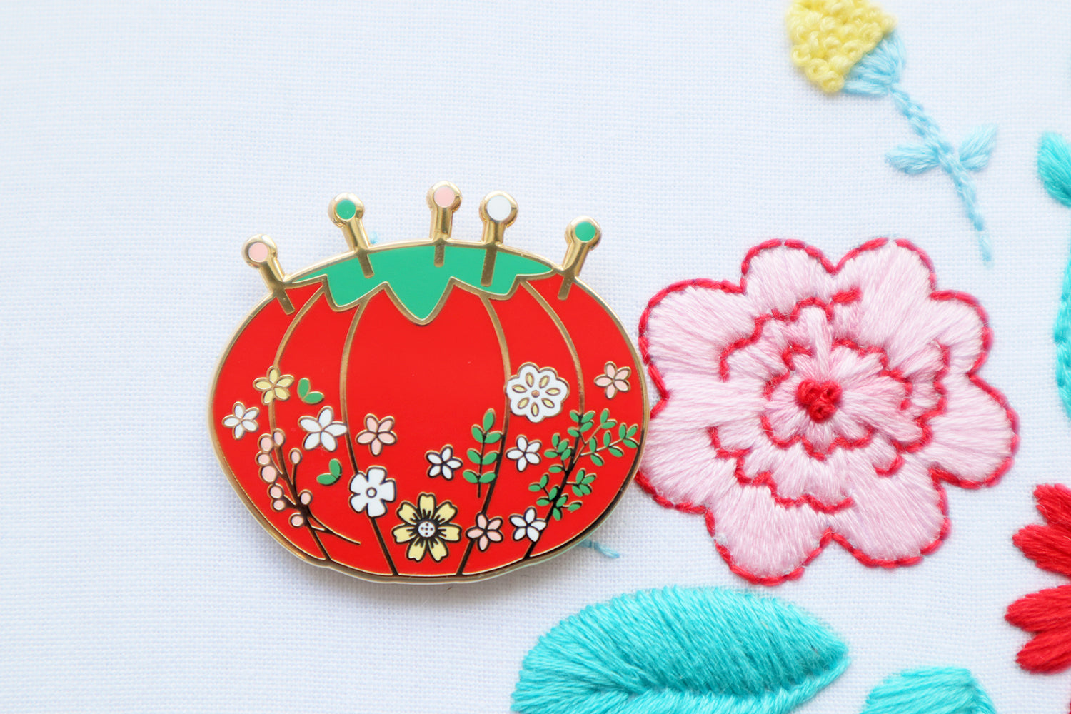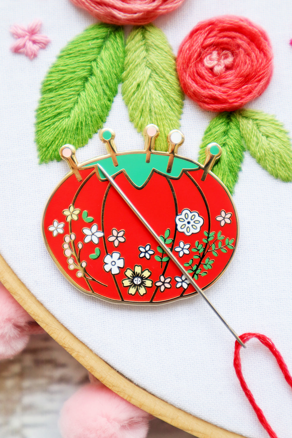This pincushion needle minder is 1 1/2" wide and 1 3/8" tall so it works great even on a small embroidery project.