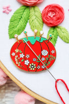 I just adore little vintage tomato pincushions - they're so cute! This vintage floral pin cushion needle minder has the same cute look and a great way to add a little flair to your stitching.